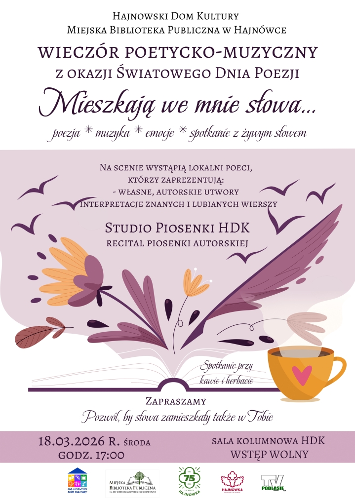 We współpracy z Hajnowskim Domem Kultury zapraszamy na wieczór poetycko-muzyczny z okazji Światowego Dnia Poezji pt. "Mieszkają we mnie słowa".