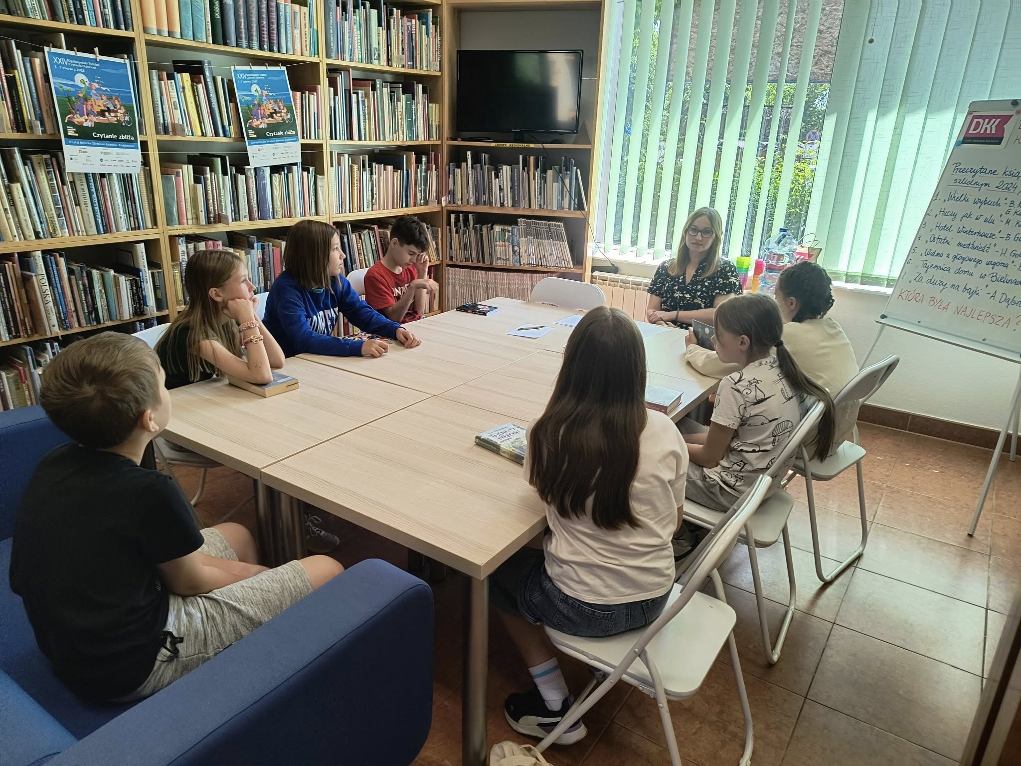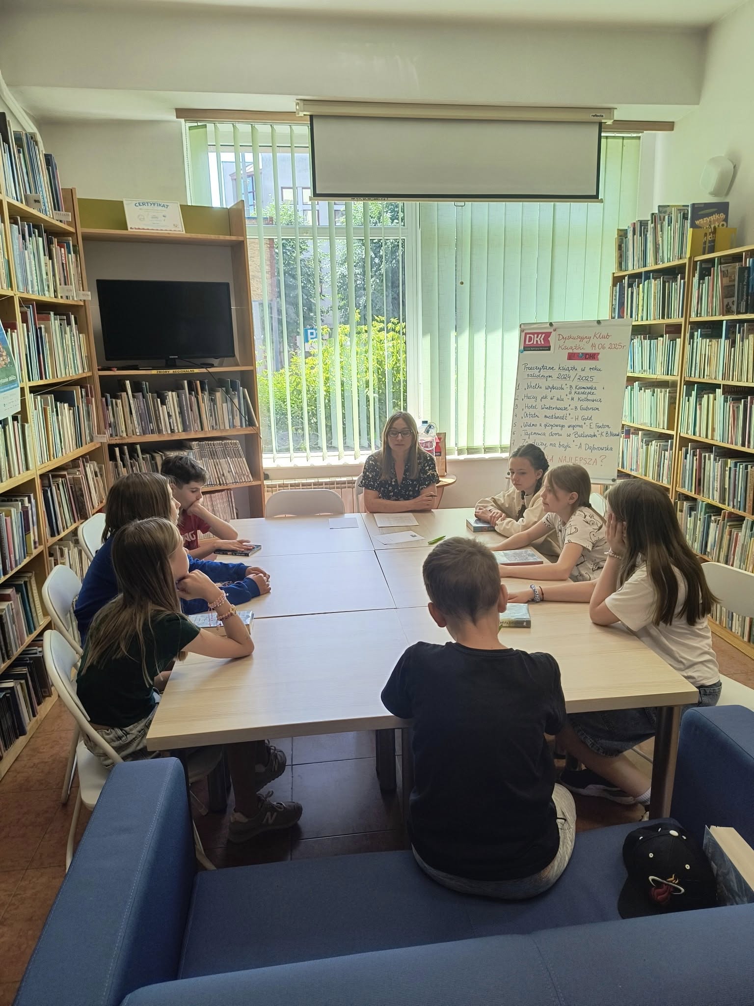 W sobotę, 14 czerwca br., odbyło się ostatnie w tym roku szkolnym spotkanie Dyskusyjnego Klubu Książki dla dzieci. W jego trakcie rozmawialiśmy o książkach wybranych przez klubowiczów, m. in. "Księgi mroku", "Sekrety hotelu Winterhouse", "Tajemnica Dąbrówki", cała seria Harry Potter, "Banda niematerialnych szaleńców", mangi: "Miecz zabójcy demonów" oraz "Jujitsu kaisen".