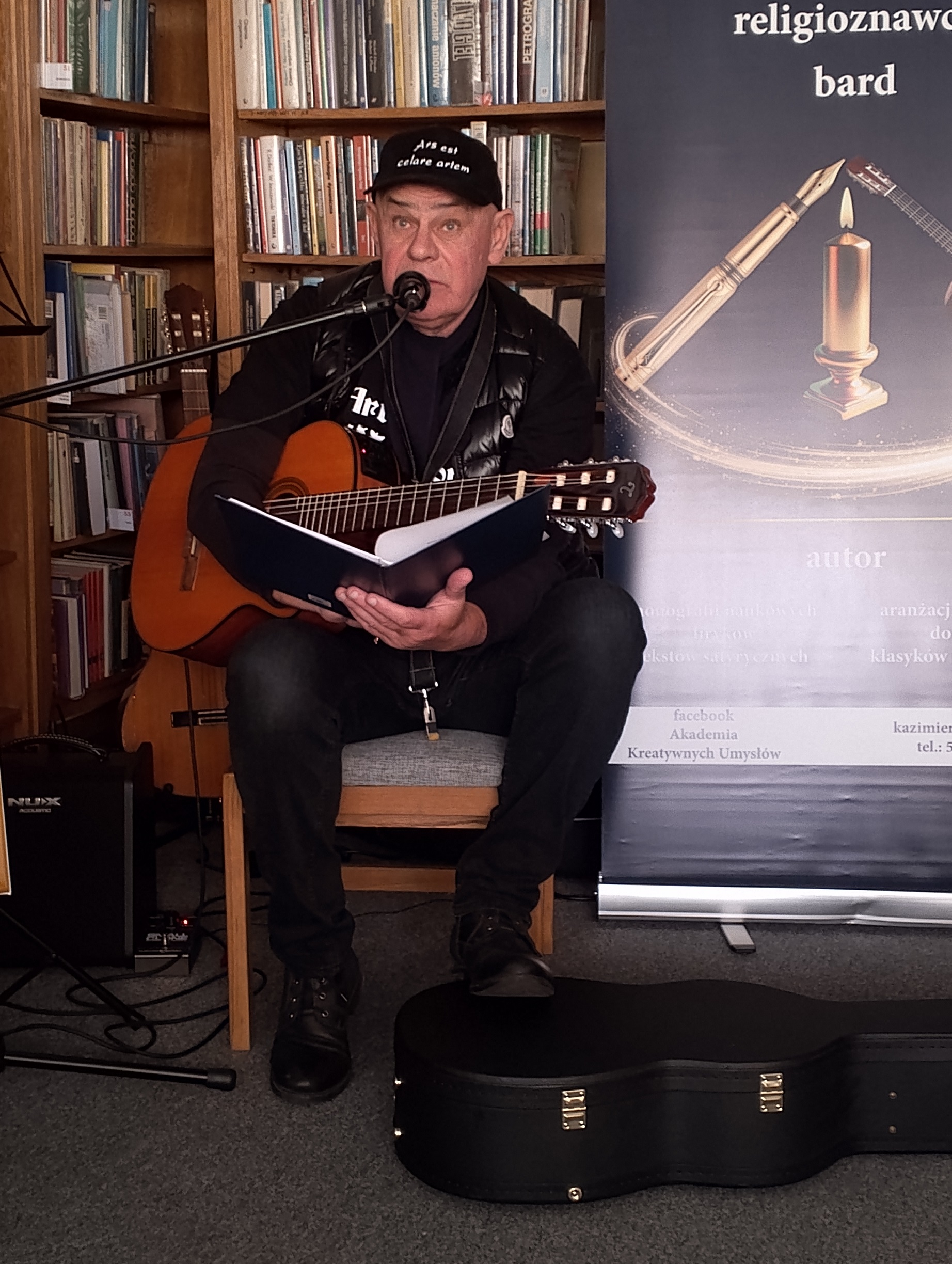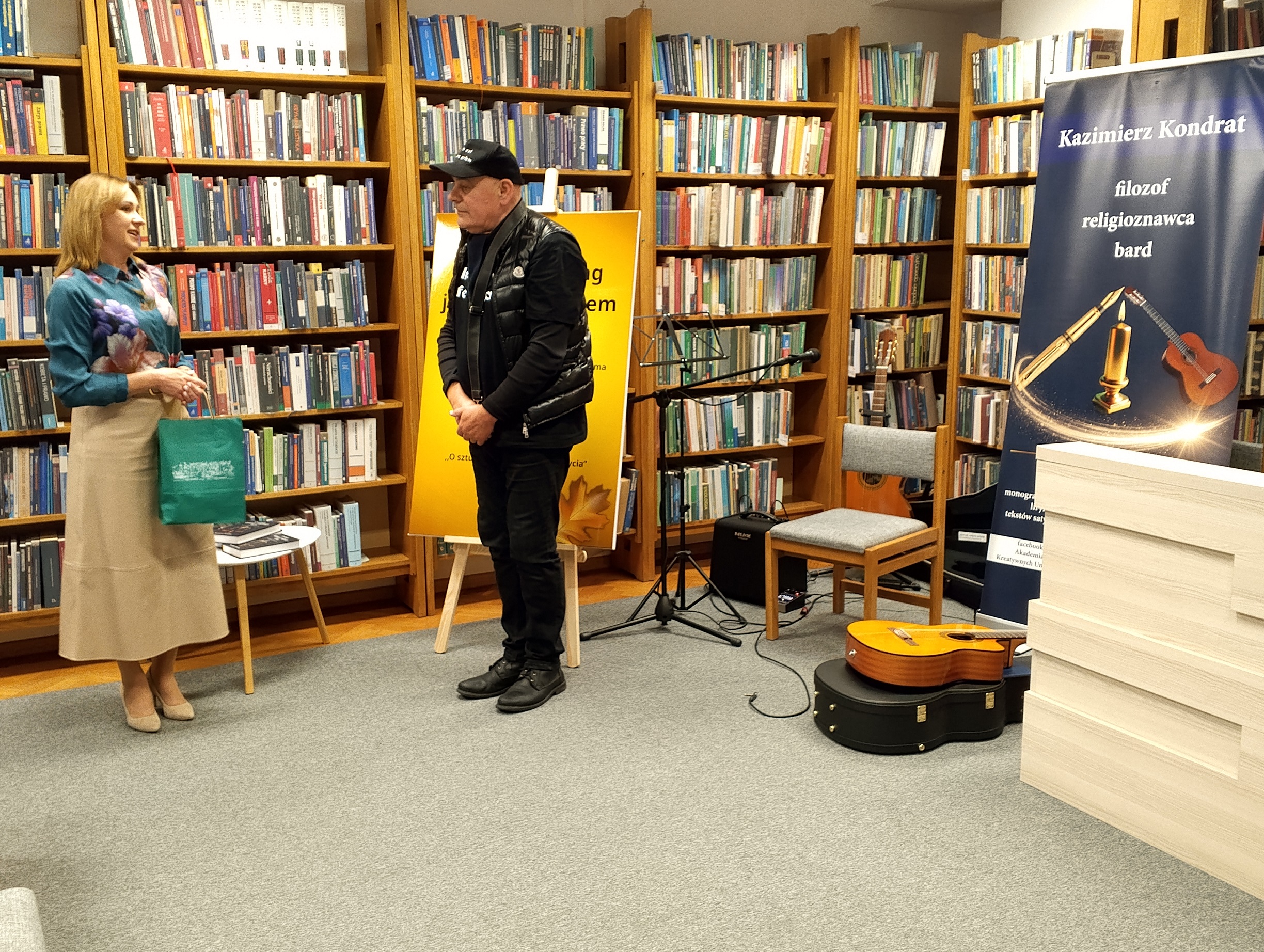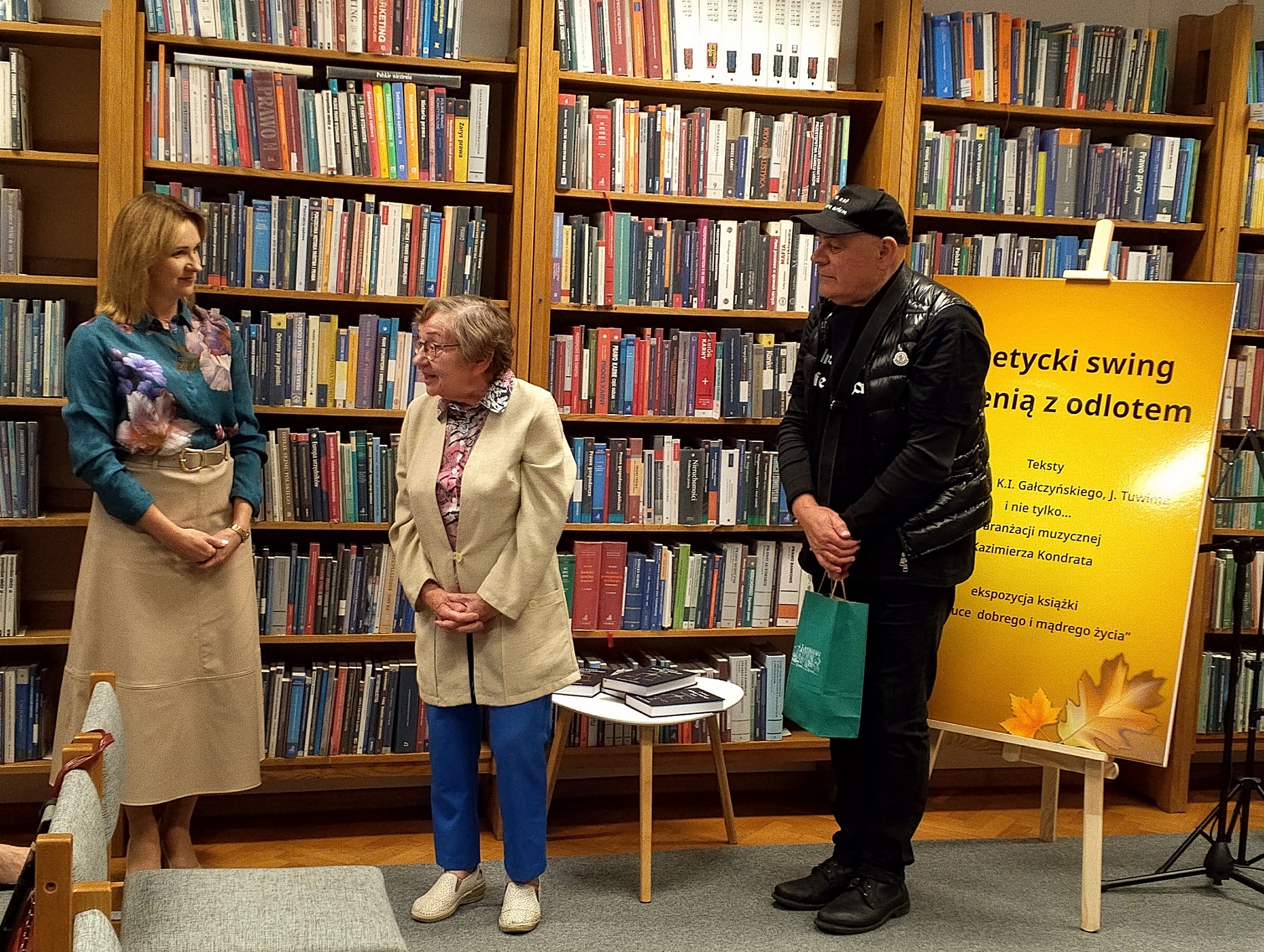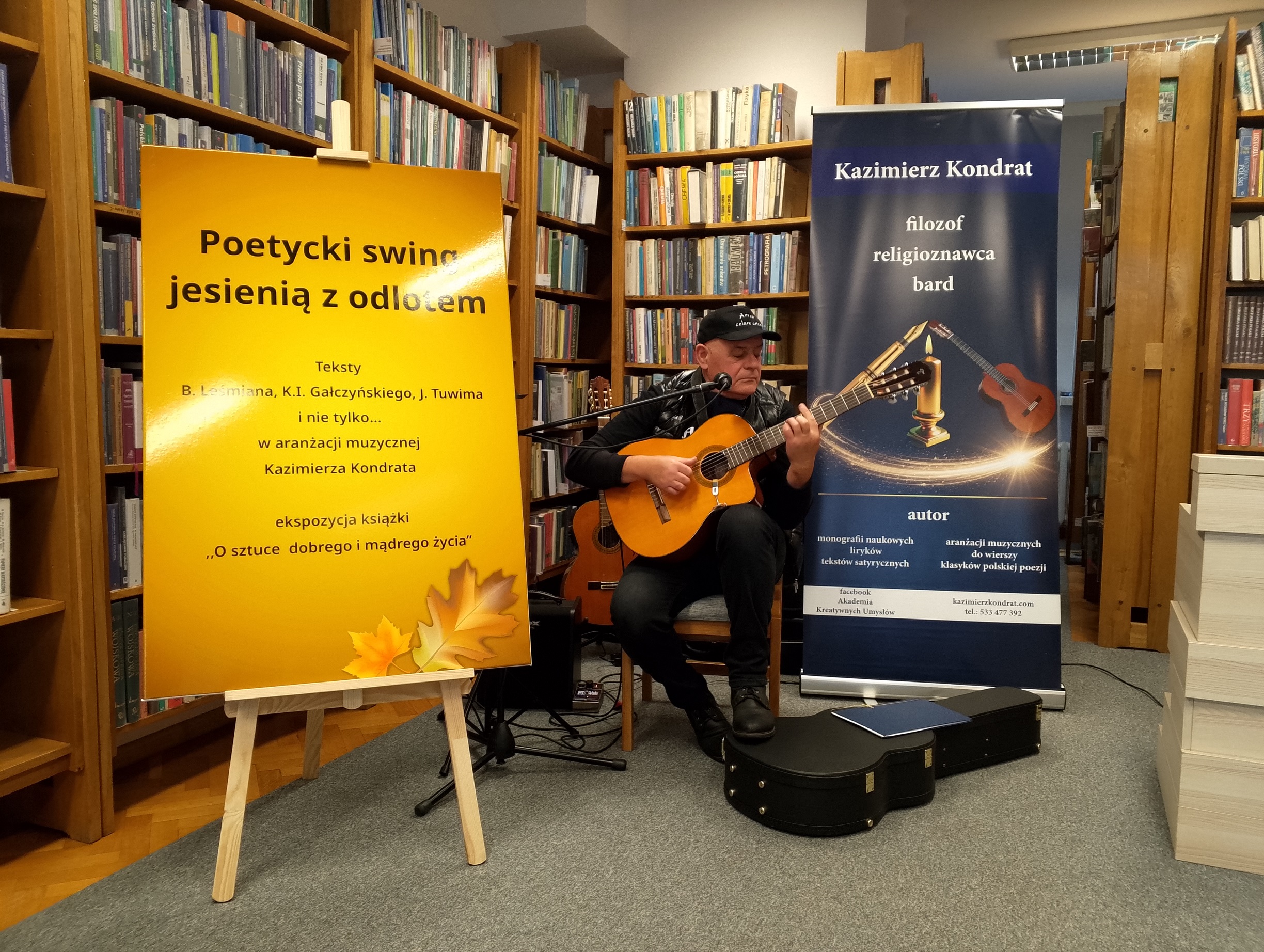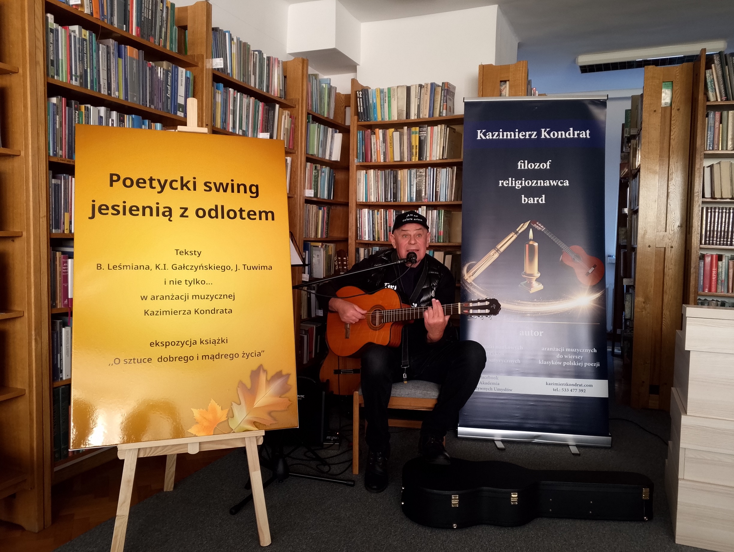 W czwartkowy wieczór w bibliotece gościliśmy Pana Kazimierza Kondrata – w jednej osobie filozofa, religioznawcę i barda. Kameralny koncert P. Kondrata pod tytułem „Poetycki swing” wprowadził nas w klimaty jesienne tekstami poetyckimi Konstantego Ildefonsa Gałczyńskiego, Juliana Tuwima czy Bolesława Leśmiana, ale także Agnieszki Osieckiej, Wolnej Grupy Bukowina oraz jego własnymi.