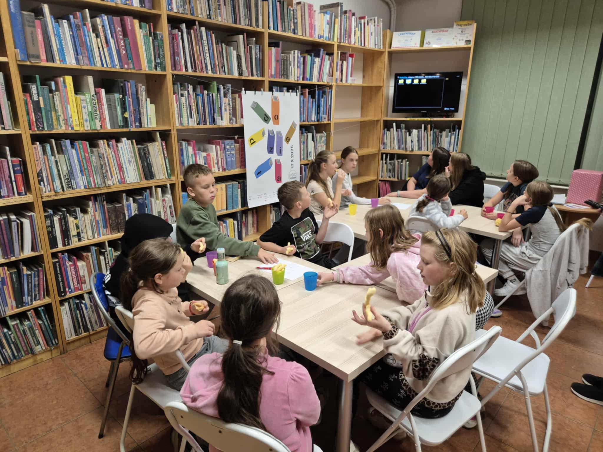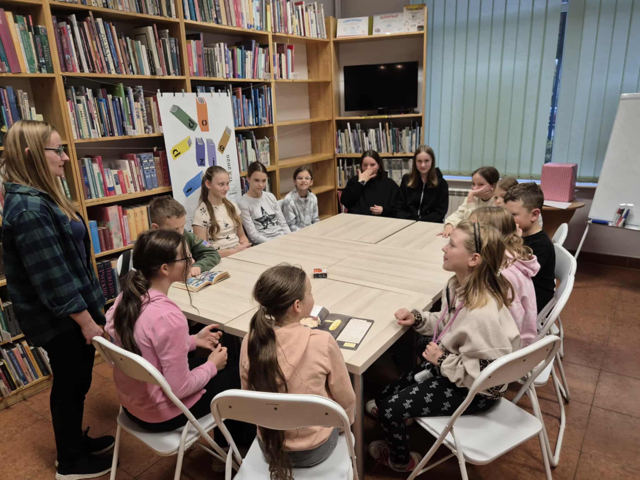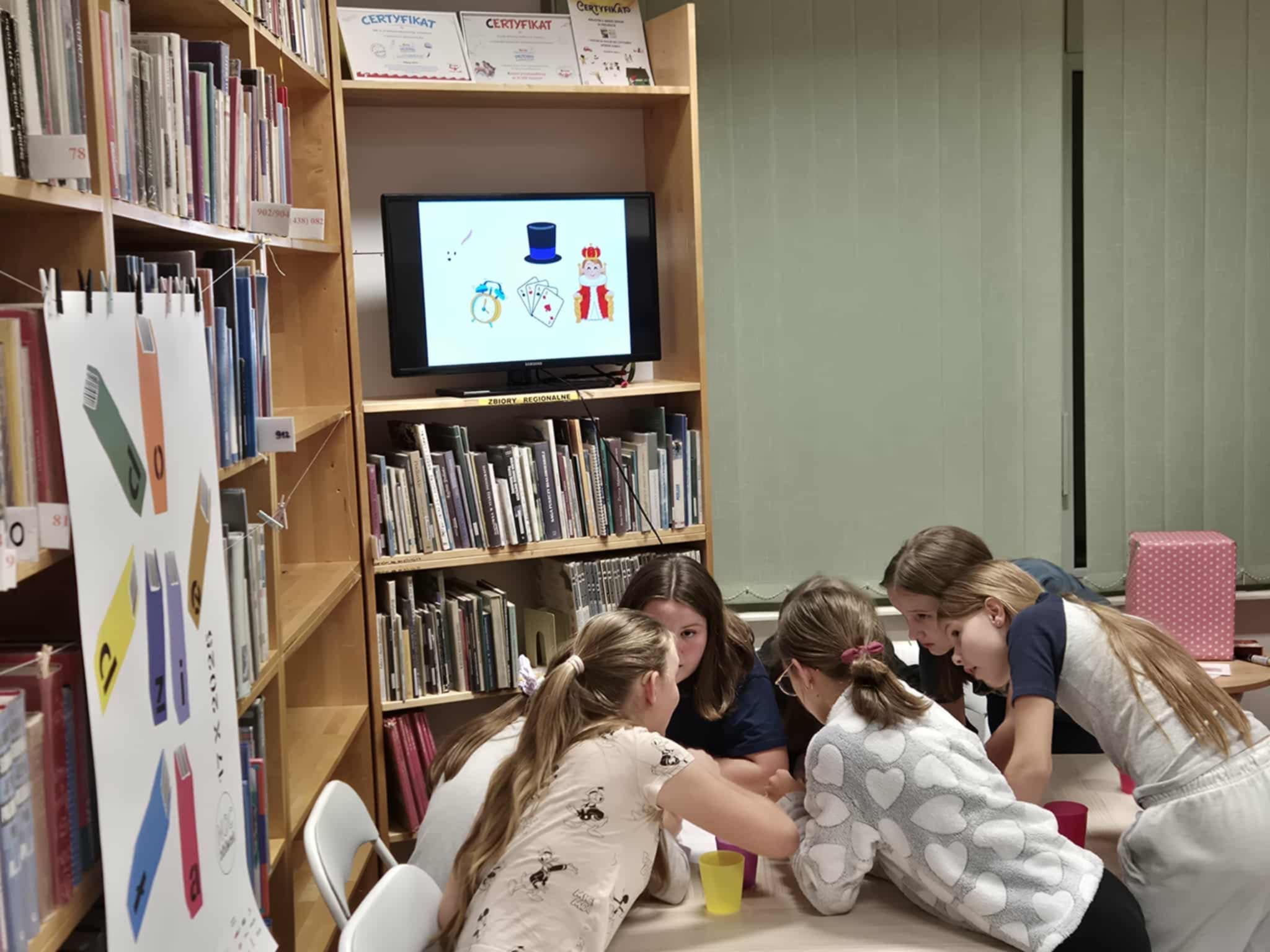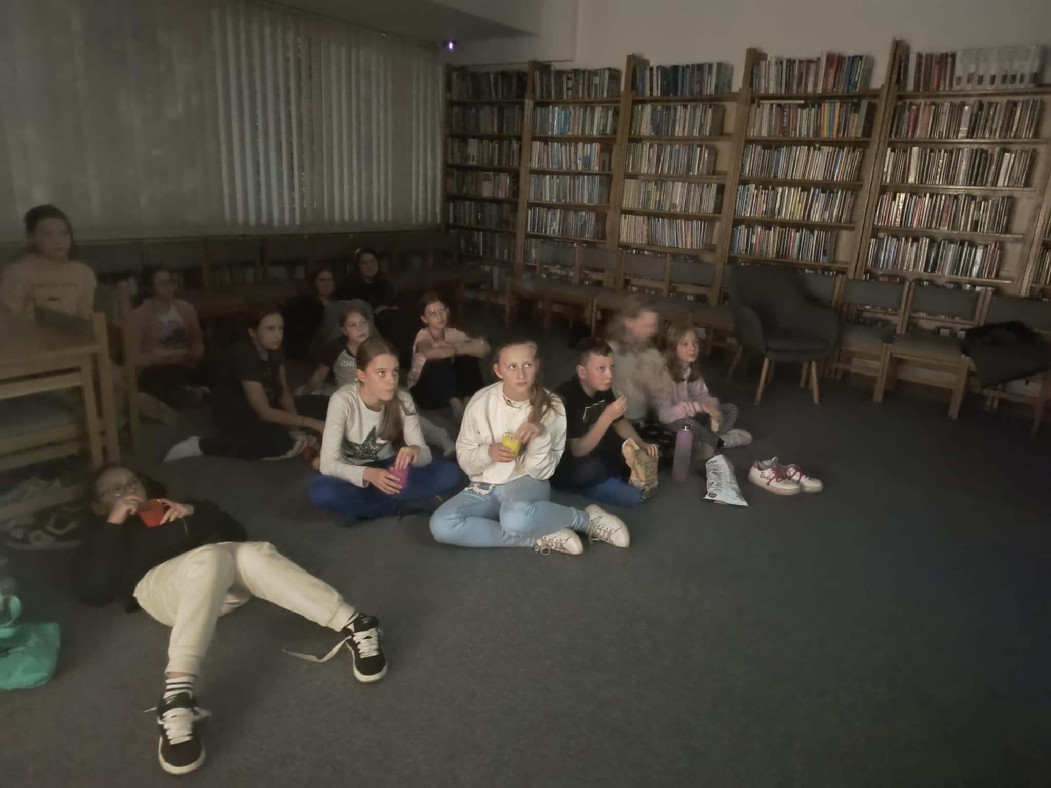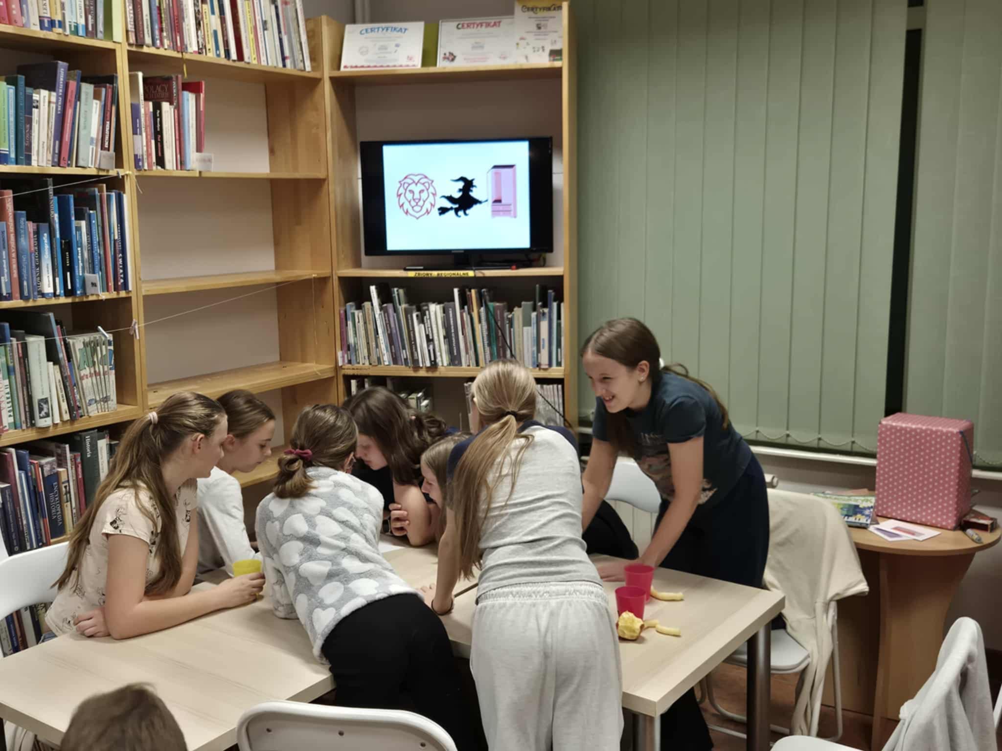 Z kolei w Oddziale dla Dzieci i Młodzieży odbył się turniej wiedzy literacko-bibliotecznej. Czternastu śmiałków, podzielonych na dwie drużyny o wymyślnych nazwach, odgadywało rebusy oraz odpowiadało na pytania dotyczące naszej biblioteki i bohaterów lektur szkolnych. Emocji było co niemiara, a lekki nastrój rywalizacji motywował naszych młodych uczestników do jeszcze większej mobilizacji i współpracy grupowej. Po czterech rundach wspólnej zabawy i małym poczęstunku, przenieśliśmy się do Czytelni dla Dorosłych, by tam obejrzeć film "Biuro Detektywistyczne Lassego i Mai. Rabuś z pociągu".