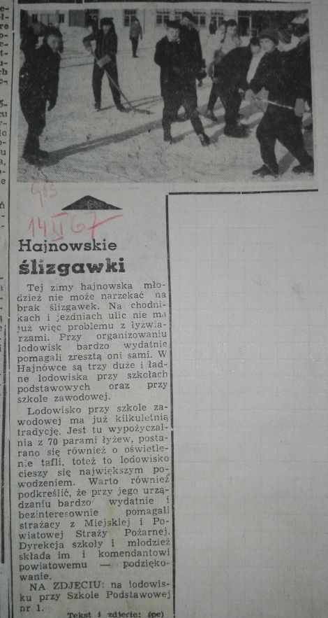 Tej zimy hajnowska młodzież nie może narzekać na brak ślizgawek. Na chodnikach i jezdniach ulic nie ma już więc problemu z łyżwiarzami. Przy organizowaniu lodowisk bardzo wydatnie pomagali zresztą oni sami. W Hajnówce są trzy duże i ładne lodowiska przy szkołach podstawowych oraz przy szkole zawodowej.