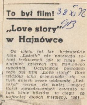 Od wielu już lat hajnowskie kino "Leśnik" nie notowało takiej frekwencji jak w ciągu ostatnich czterech dni minionego tygodnia. Oczywiście powodem tego był film "Love story". Ilość widzów jaka przewinęła się w tych dniach przez widownię "Leśnika" równa się mniej więcej ilości sprzedawanych ostatnio w tym kinie biletów w ciągu co najmniej dwóch miesięcy.