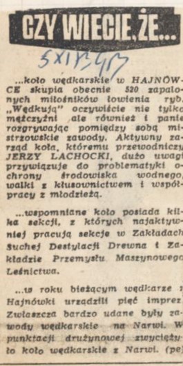 Zapraszamy do lektury archiwalnych artykułów z Gazety Białostockiej na temat wędkarstwa i działalności koła wędkarskiego w Hajnówce.