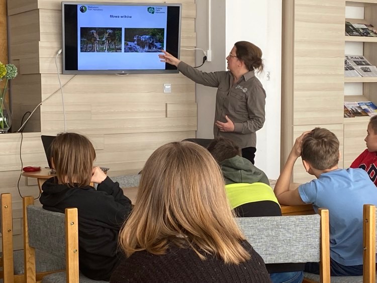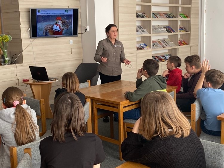 Czwartkowe przedpołudnie w Miejskiej Bibliotece Publicznej w Hajnówce upłynęło pod znakiem wilka. Gościliśmy Panią Hannę Schmidt z Białowieskiego Parku Narodowego, która wprowadziła uczniów klasy V ze Szkoły Podstawowej Nr 1 w Hajnówce w wilczy świat.