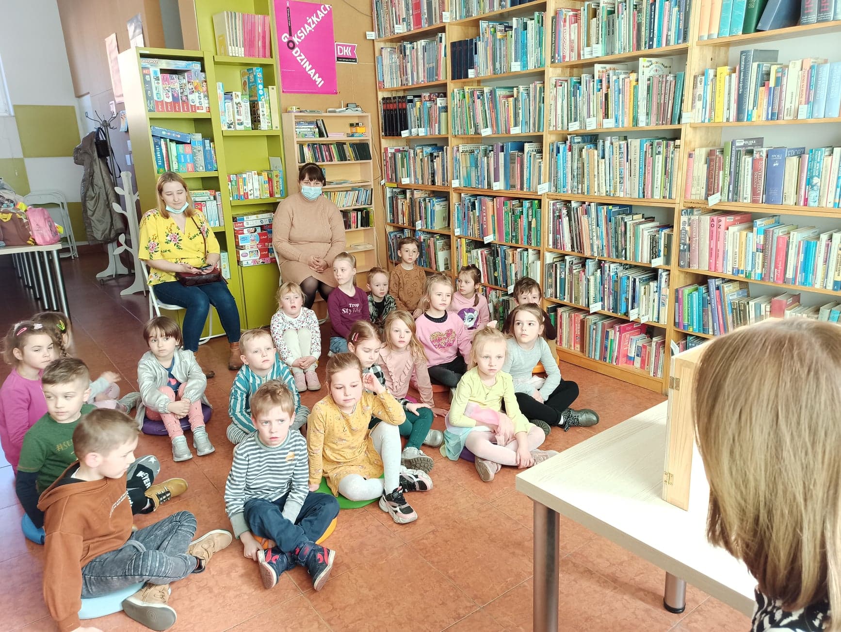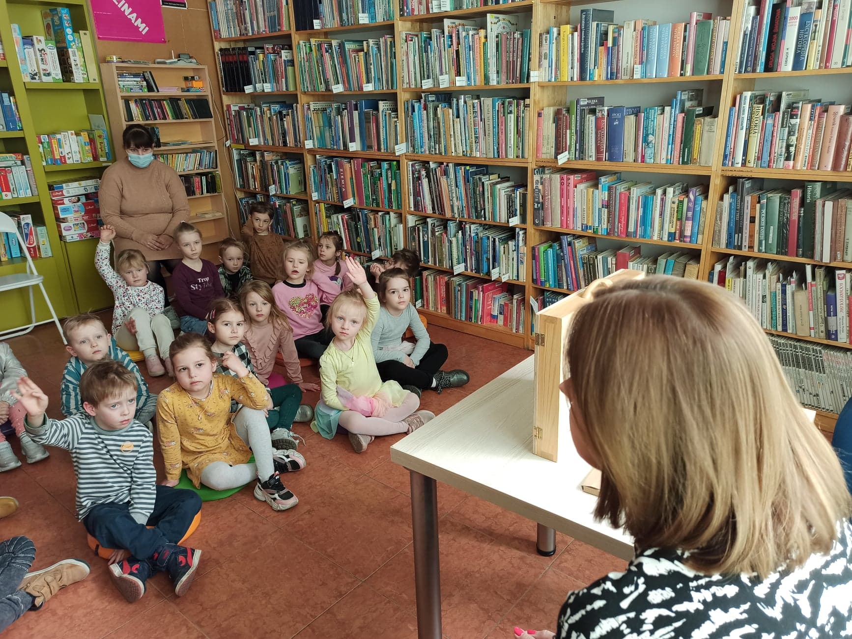 Miały one okazję poznać magiczny drewniany teatrzyk – KAMISHIBAI. Kamishibai Papierowy Teatr to teatr obrazkowy lub inaczej teatr ilustracji. Jest to technika opowiadania, czytania wywodząca się z Japonii, wykorzystując plansze z obrazkami i tekstem oraz drewnianą skrzynką – na wzór parawanu z teatrzyków marionetkowych – w której przedstawiane są kolejne fragmenty historii, bajki, opowiadania. Nasi mali goście obejrzeli sztukę Magdaleny Zarębskiej „Smok Wawelski” z przepięknymi ilustracjami Elżbiety Gaudasińskiej.
