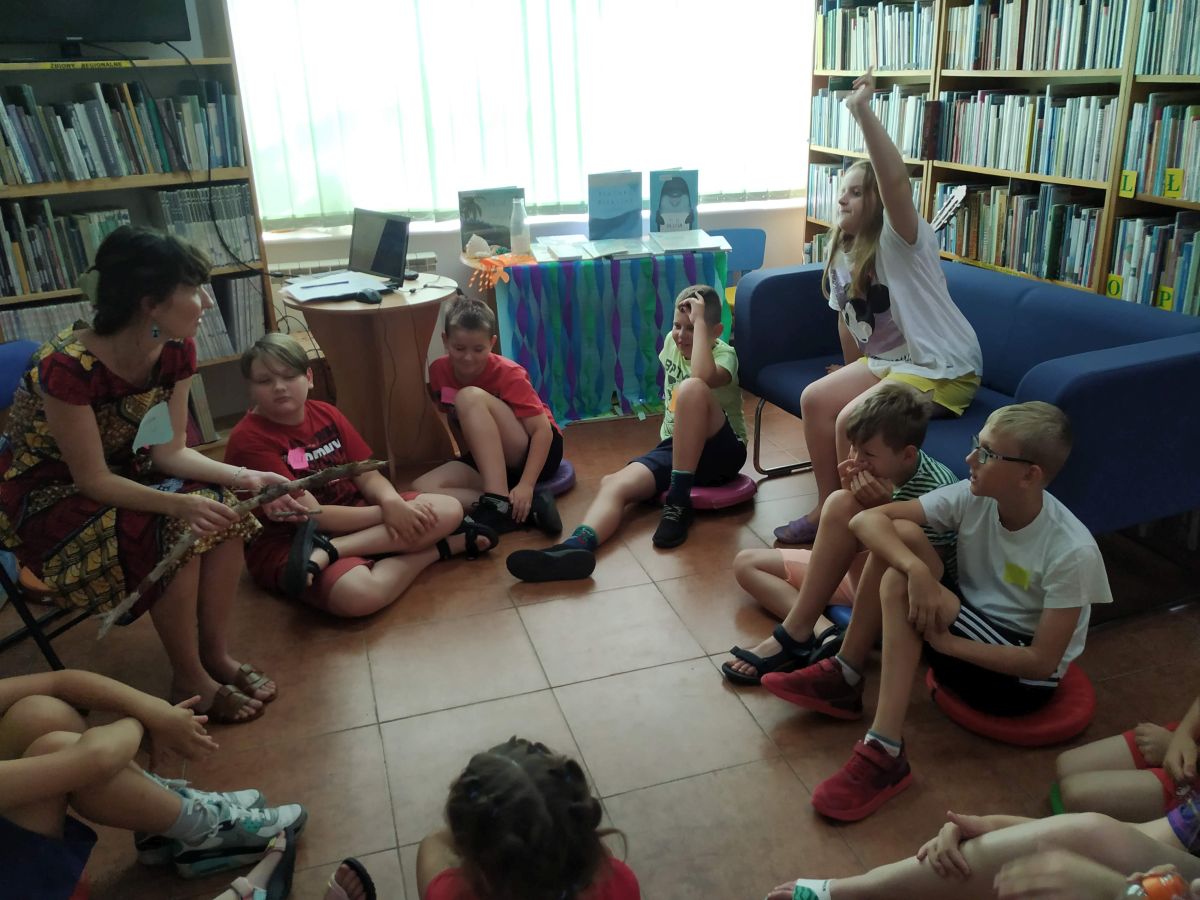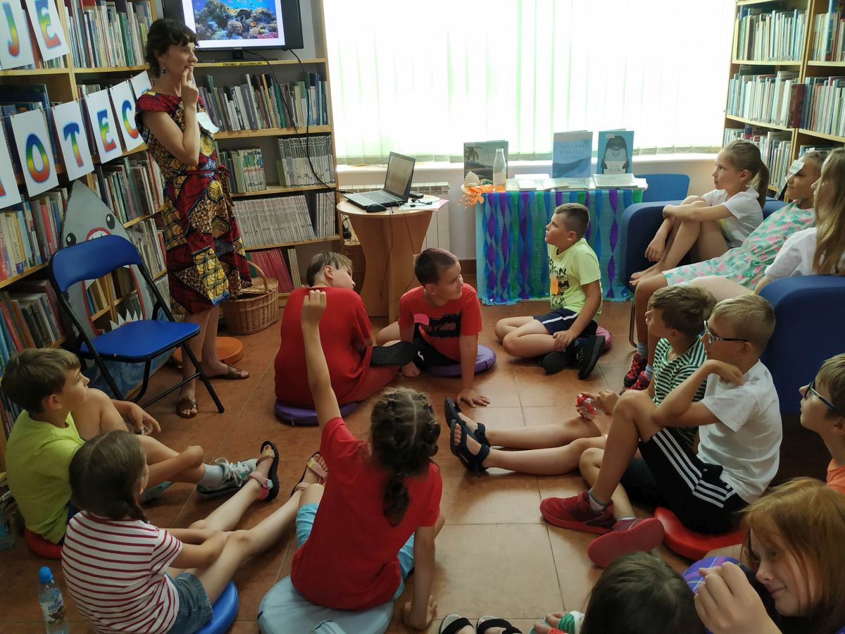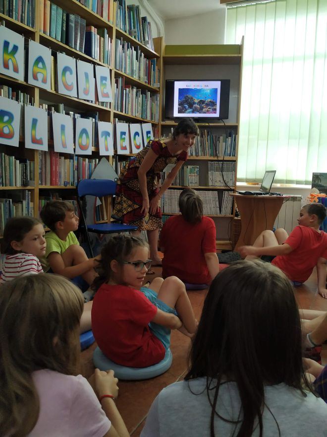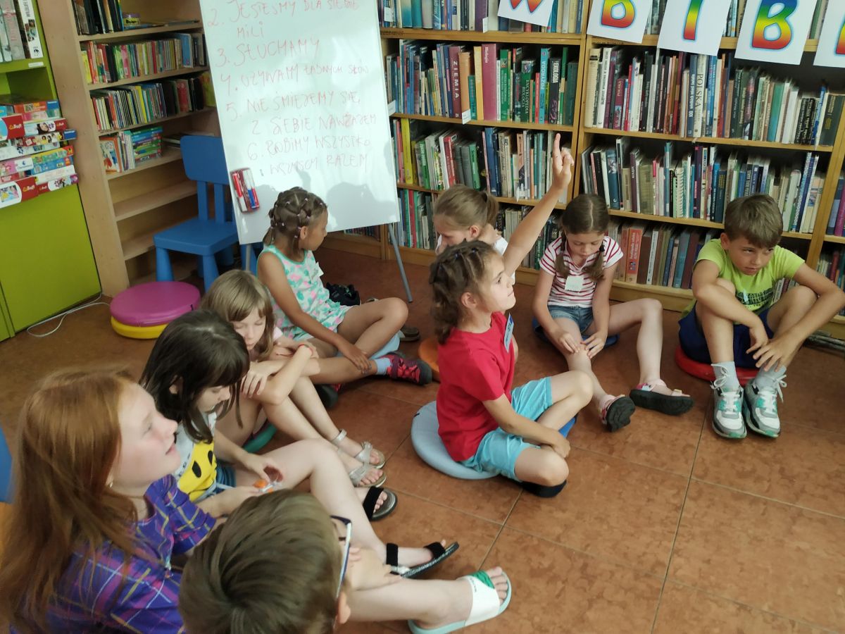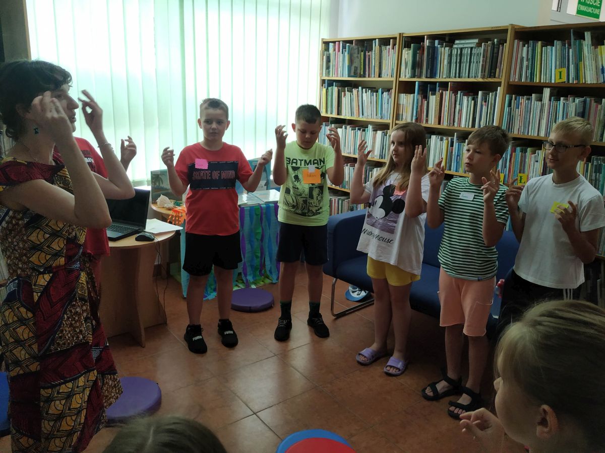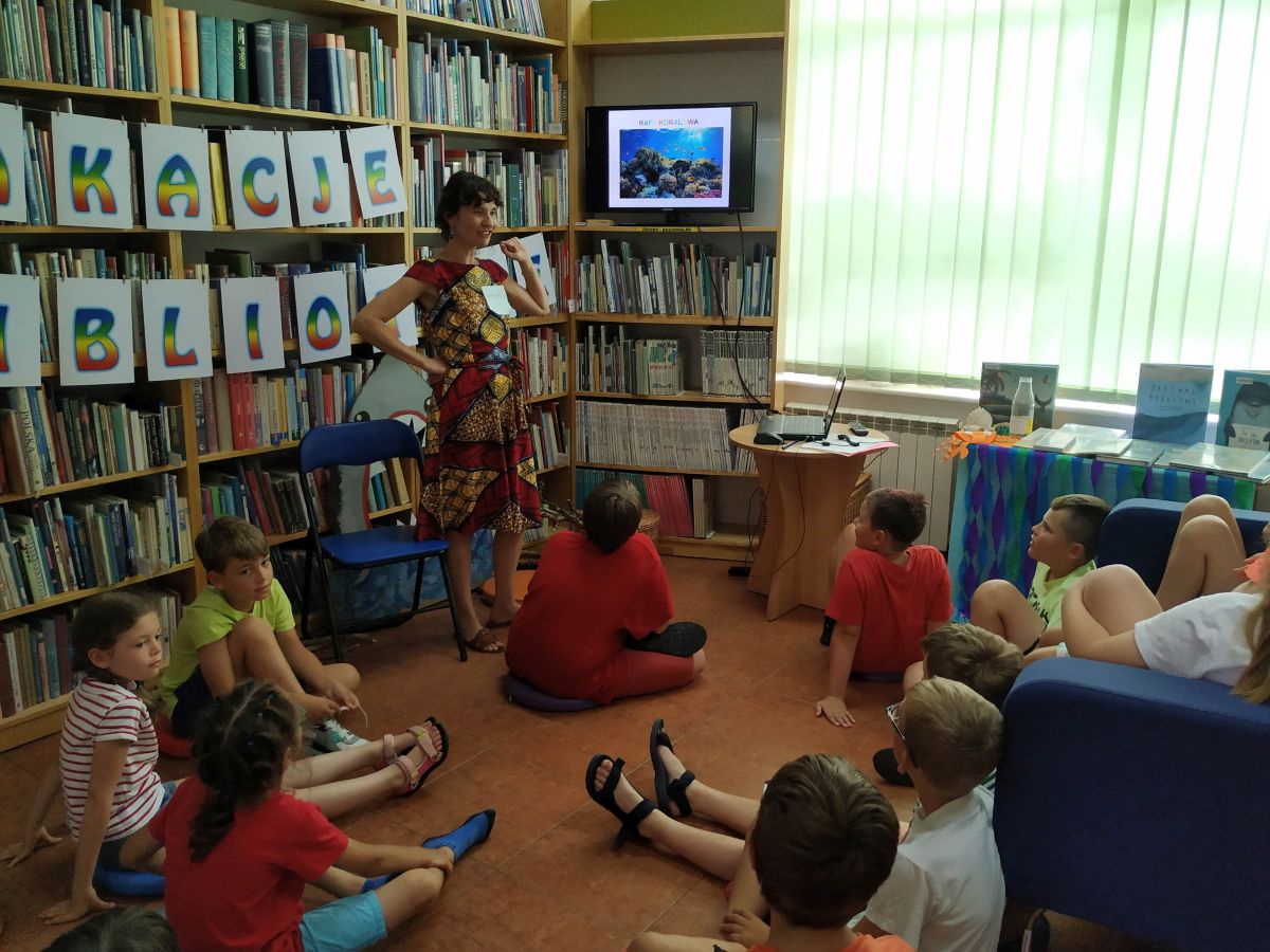 Uczestnicy poznali swoje imiona i zainteresowania, zrobili własne wizytówki, następnie zintegrowali się uczestnicząc w zabawach śpiewno-ruchowych. Grupa okazała się bardzo zdolna pod względem muzycznym, więc świetnie nam wyszło śpiewanie przy gitarowym akompaniamencie "Hymnu Biblioteki", ułożonego przez pracowników pod linię melodyczną przeboju "Ale jazz!" polskiej wokalistki Zuzanny Jurczak znanej jako Sanah. Następnie przedstawiona prezentacja o rafie koralowej była inspiracją do wykonania wakacyjnych zawieszek na gałęziach w morskim klimacie z przygotowanych wcześniej szablonów.