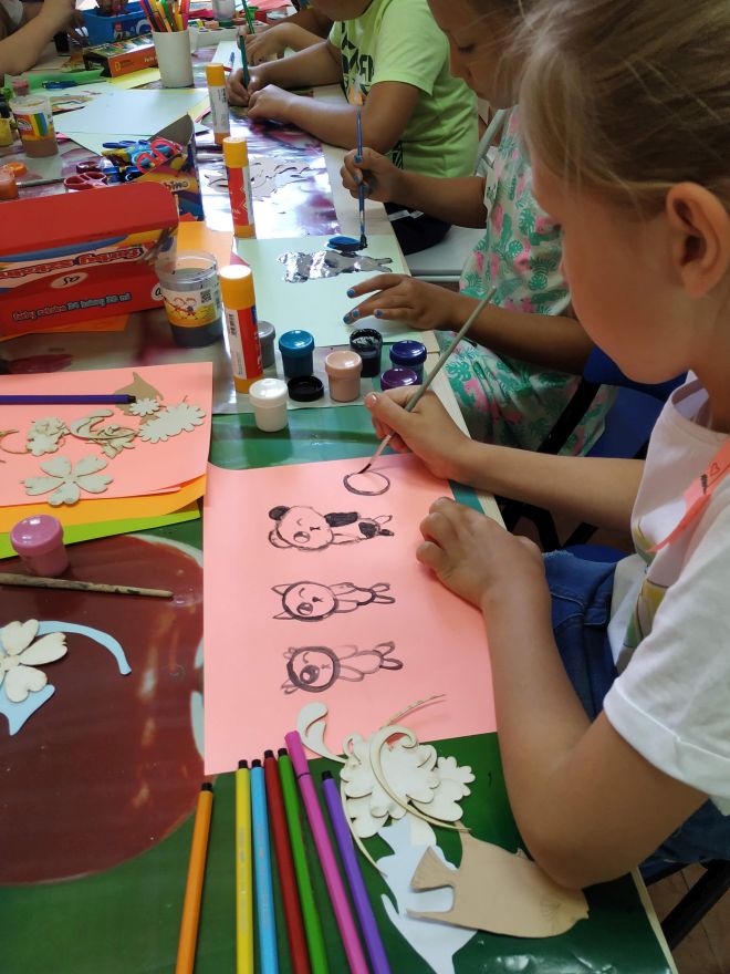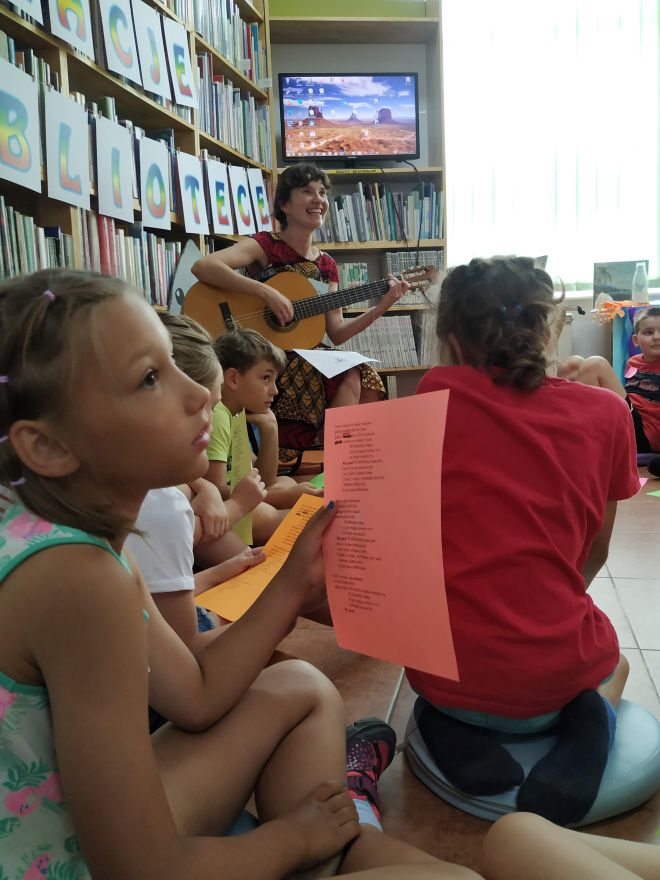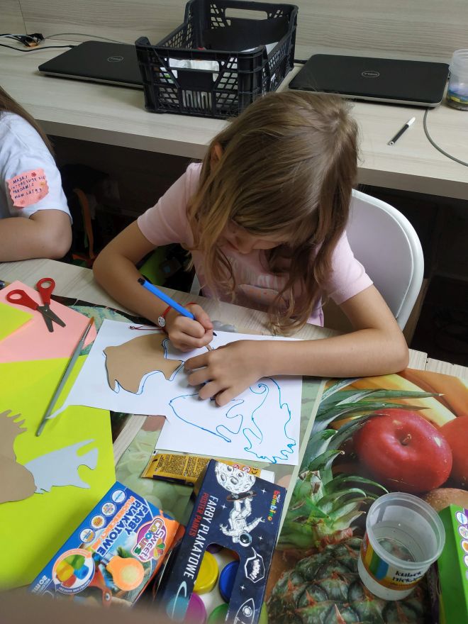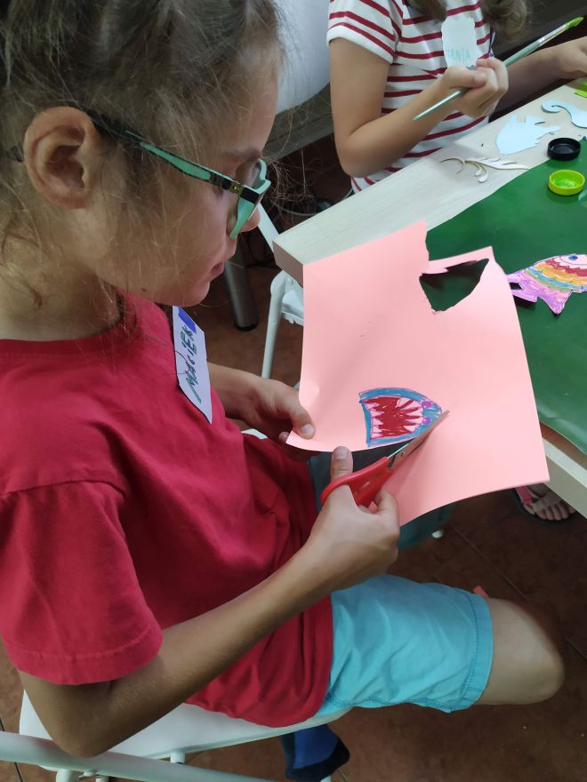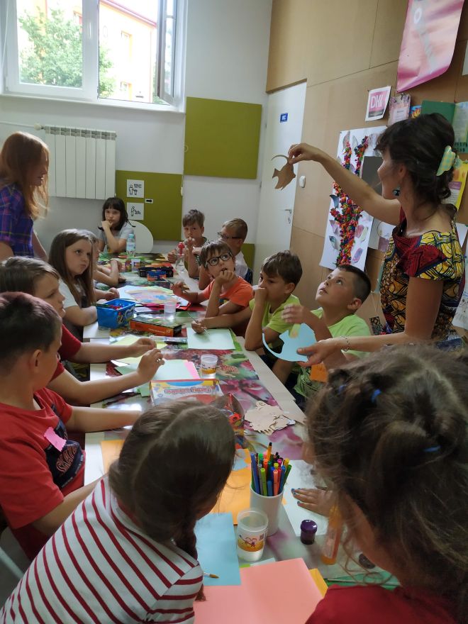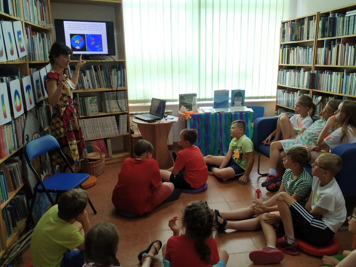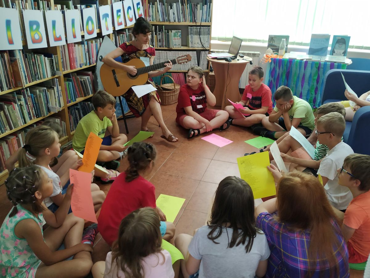 Uczestnicy poznali swoje imiona i zainteresowania, zrobili własne wizytówki, następnie zintegrowali się uczestnicząc w zabawach śpiewno-ruchowych. Grupa okazała się bardzo zdolna pod względem muzycznym, więc świetnie nam wyszło śpiewanie przy gitarowym akompaniamencie "Hymnu Biblioteki", ułożonego przez pracowników pod linię melodyczną przeboju "Ale jazz!" polskiej wokalistki Zuzanny Jurczak znanej jako Sanah. Następnie przedstawiona prezentacja o rafie koralowej była inspiracją do wykonania wakacyjnych zawieszek na gałęziach w morskim klimacie z przygotowanych wcześniej szablonów.
