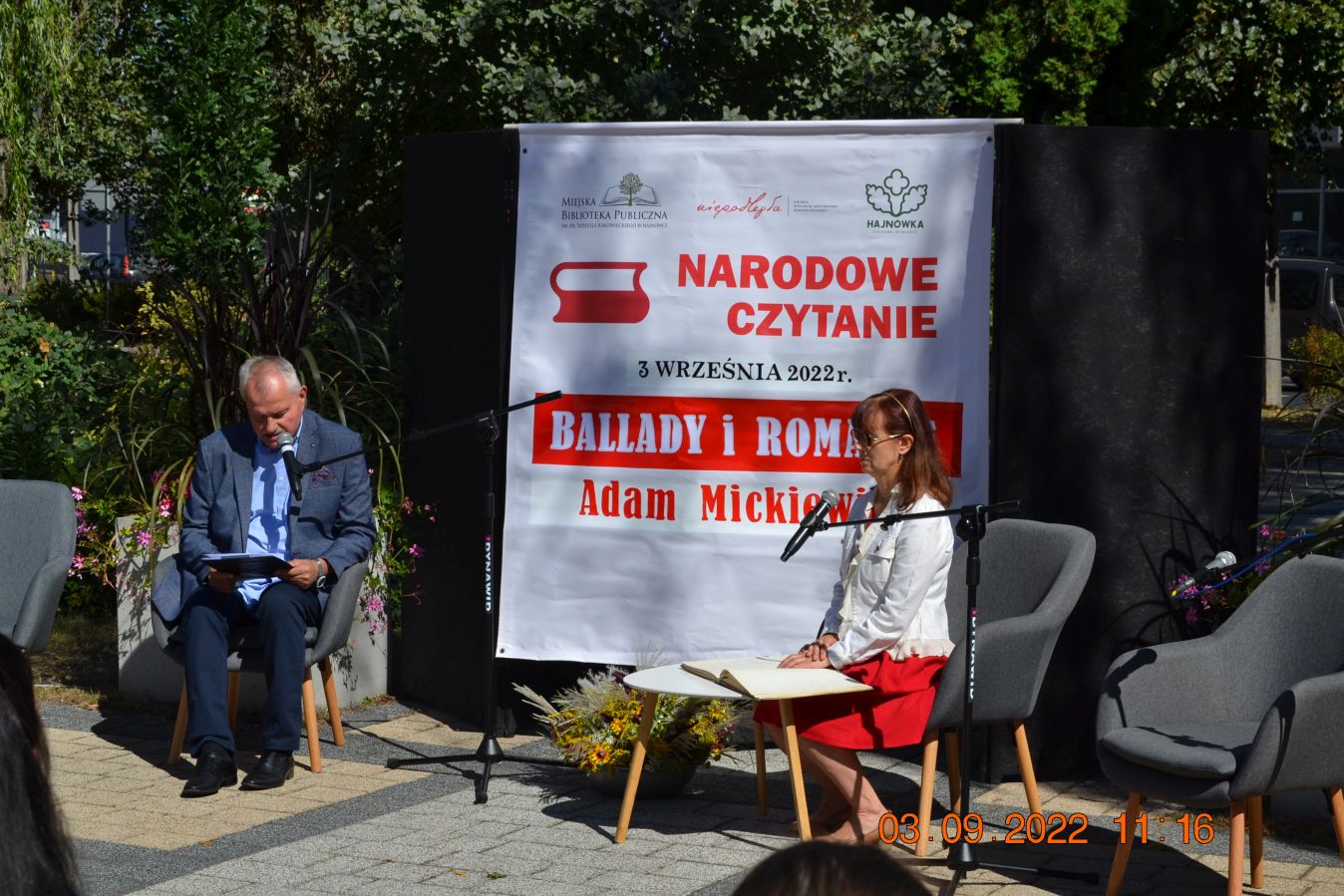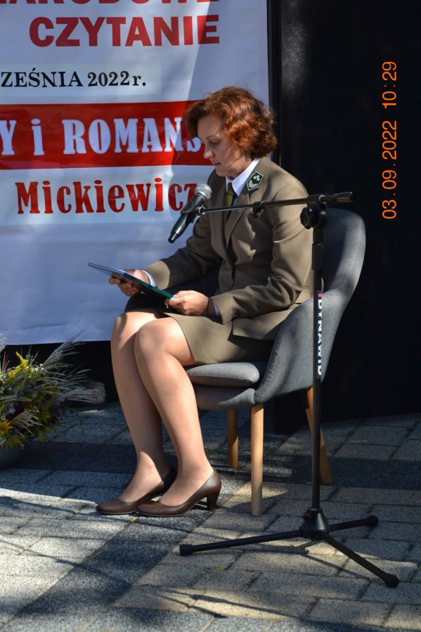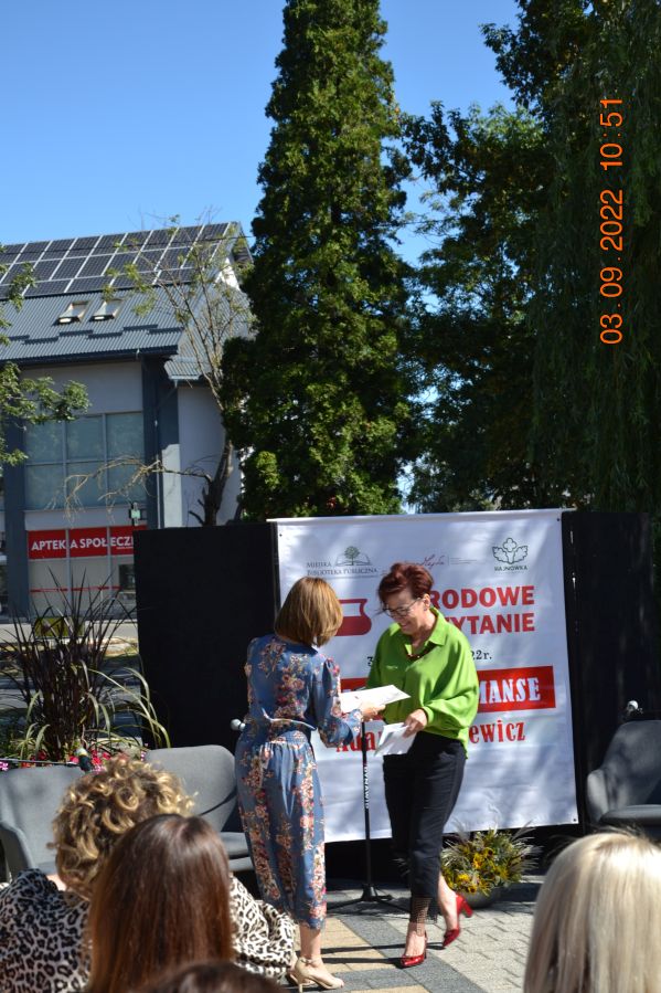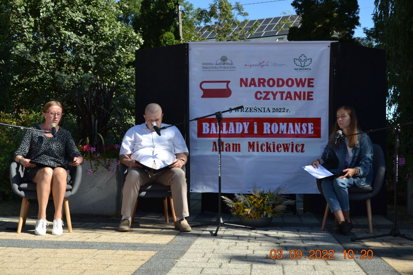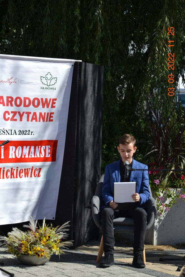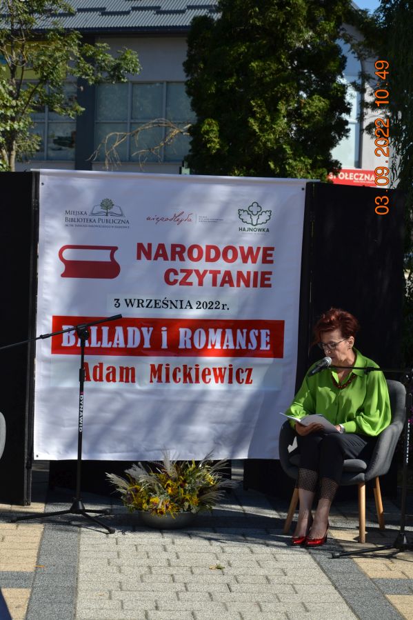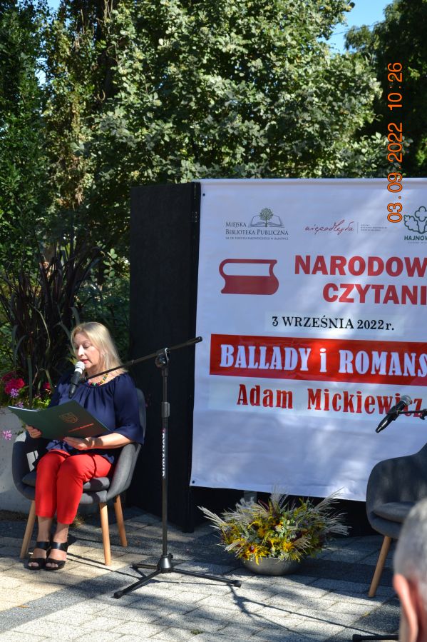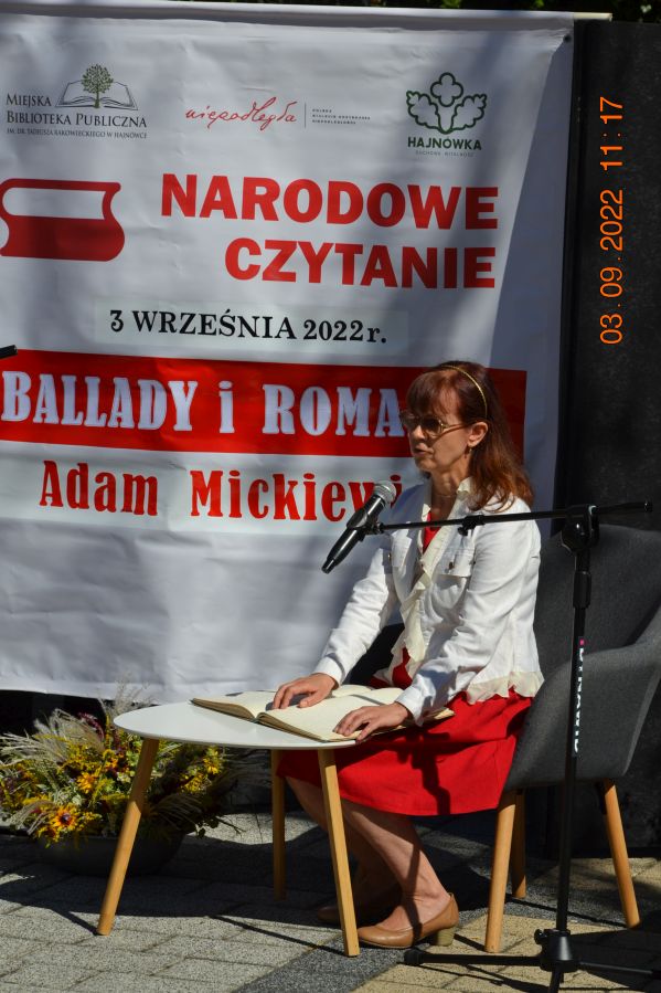 Tegoroczną lekturą były „Ballady i romanse” Adama Mickiewicza, wydane dwieście lat temu w Wilnie, które wyznaczają początek polskiego romantyzmu i po dziś dzień zachwycają wyjątkową aurą, niezrównanymi opisami natury i mądrością opartą na ludowej prawdzie. W pięknej scenerii skweru, otuleni ciepłem wrześniowego słońca, nasi czytający zaprezentowali utwory z tomu „Ballad i romansów”, zachwycając warsztatem i dojrzałością interpretacji. Mogliśmy wysłuchać „Świtezianki” w wykonaniu burmistrza Jerzego Siraka, wice starościny Joanny Kojło i wójt gminy Hajnówka – Lucyny Smoktunowicz. Balladę „Powrót taty” przeczytali podopieczni Warsztatu Terapii Zajęciowej, „Kurhanek Maryli” wybrzmiał w interpretacji przedstawicieli Środowiskowego Domu Samopomocy. Z kolei „Rybkę” zaprezentowała delegacja Polskiego Związku Niewidomych Koła Terenowego w Hajnówce, odczytując fragment tekstu napisaną alfabetem Braille’a. Tegoroczna edycja jeszcze mocniej utwierdziła nas w przekonaniu, że mamy niezwykle utalentowaną młodzież szkolną. Doskonała interpretacja „Pani Twardowskiej” uczennic ze Szkoły Podstawowej Nr 3, zaskakująco dojrzałe wykonanie mrocznej ballady „Lilije” przez Małgorzatę Durzyńską – uczennicę Szkoły Podstawowej Nr 1, czy „Dudarza”, którego odczytali przed publicznością uczniowie Szkoły Podstawowej Nr 2 Michał Zajkowski i Kajetan Szwed, napawają dumą i satysfakcją.