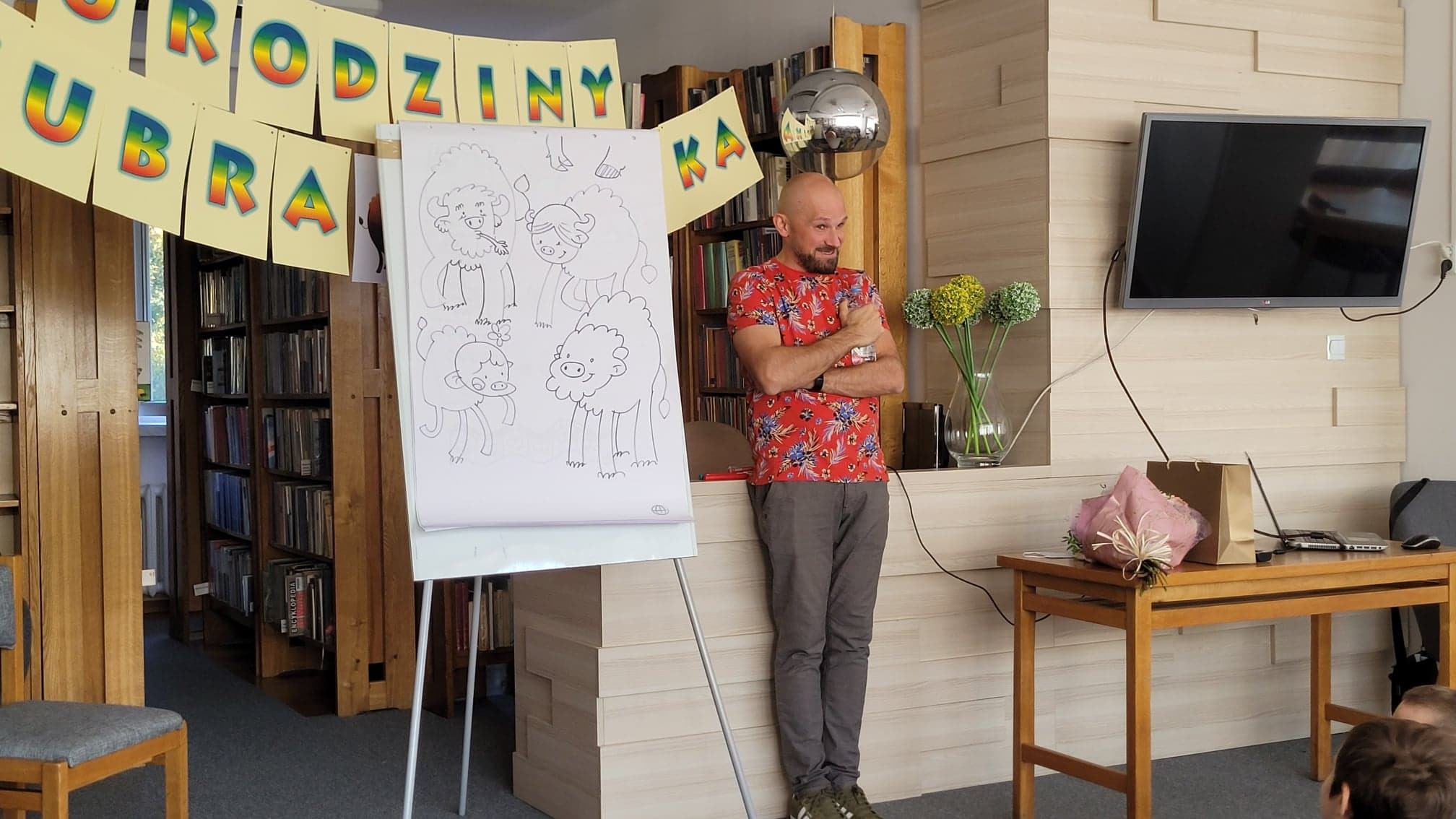 Tym razem to uczniowie klas drugich ze szkół podstawowych nr 4 i 3 w Hajnówce wzięli udział w „Literackich urodzinach...”, poznając między innymi sekretny sposób autora na rysunek żubrzej rodziny oraz zwyczaje i zachowania tych imponujących rozmiarem i siłą mieszkańców Puszczy Białowieskiej. Pan Tomasz, wieloletni pracownik Instytutu Biologii Ssaków Polskiej Akademii Nauk, podzielił się z dziećmi ciekawostkami z życia tych niekwestionowanych królów polskich lasów, przy okazji przestrzegł przed nieodpowiedzialnym zachowaniem w kontaktach z tymi zwierzętami. Bo choć Pompik, Polinka, Porada i Pomruk są niezwykle sympatyczną żubrzą rodziną, z którą dzieci mogą poznawać świat przyrody, panujące w niej zwyczaje i zachodzące zjawiska, to w naturalnym środowisku żubr powinien budzić należny mu respekt.