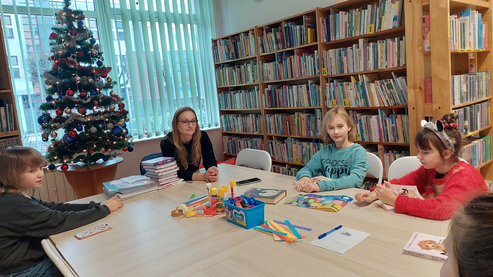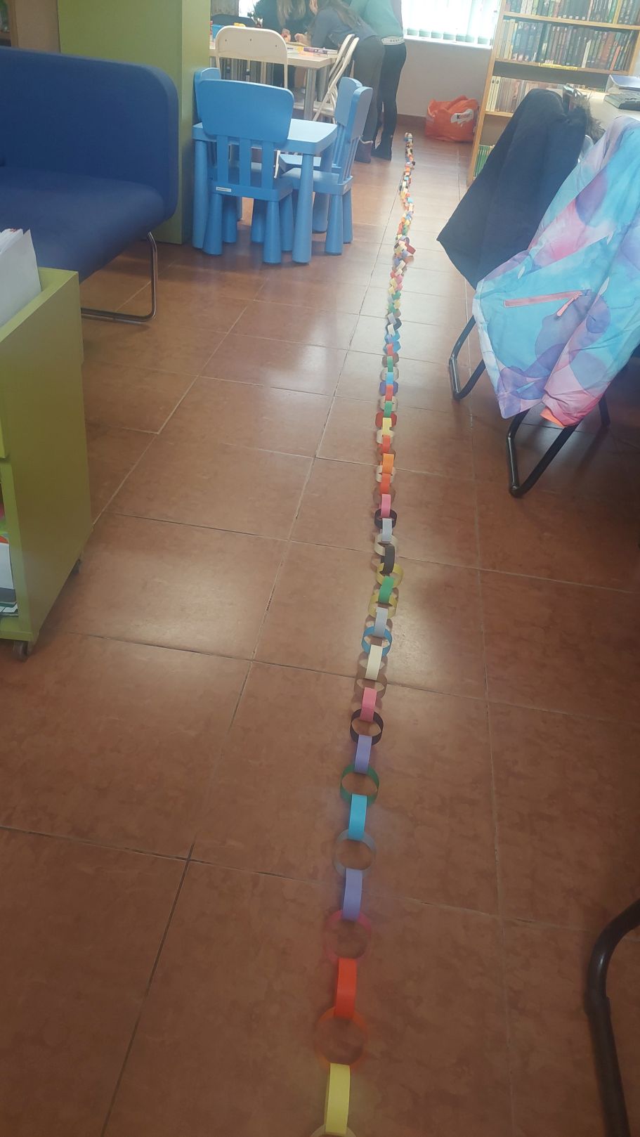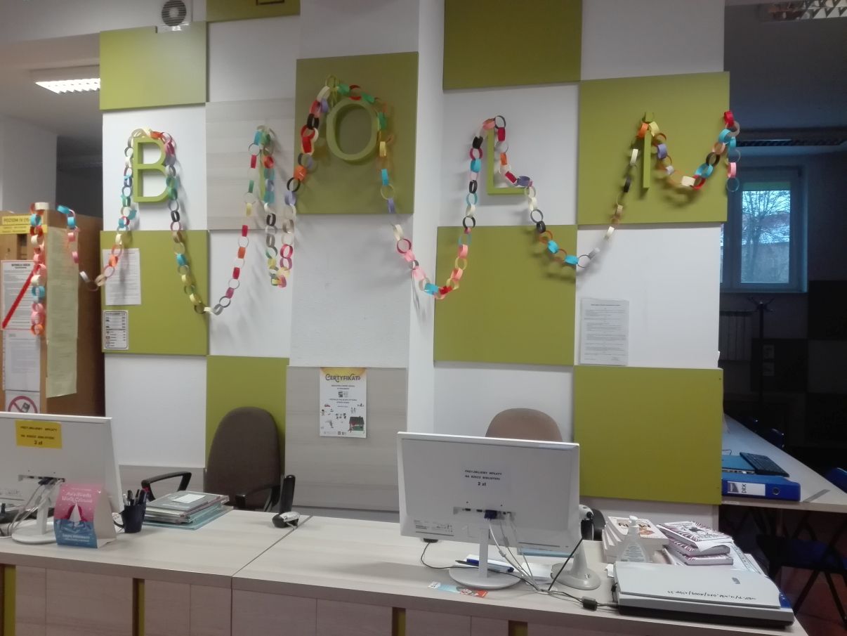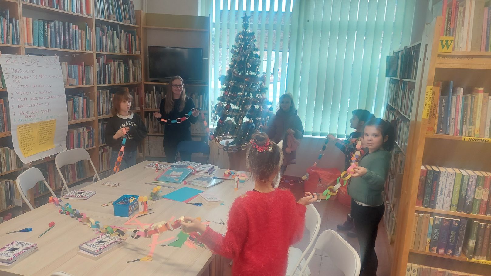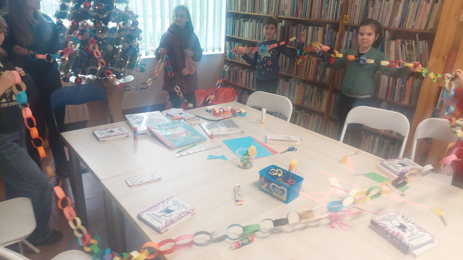 Dodatkiem do sobotniego spotkania było wysłuchanie opowieści autorstwa Lucy Rowland pt. "Mruczęty kot Mikołaja". Historia o wiecznie zaspanym kocie rozbawiła klubowiczów i nastroiła świątecznie. Dlatego w dalszej części spotkania rozmawialiśmy m.in. o pisaniu listów do św. Mikołaja, prezentach gwiazdkowych i ubieraniu choinki. A między rozmową i słuchaniem opowieści o Mruczętym, wspólnie robiliśmy kolorowy łańcuch. Naszym celem było zrobienie najdłuższego łańcucha w mieście, więc na koniec postanowiliśmy go zmierzyć. Wynik mierzenia ucieszył i zaskoczył wszystkich - aż 11 metrów! Łańcuch zawisł w Wypożyczalni dla Dzieci i jest widoczny dla wszystkich czytelników wchodzących do Oddziału dla Dzieci i Młodzieży.