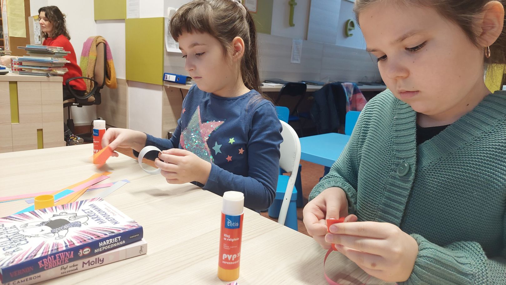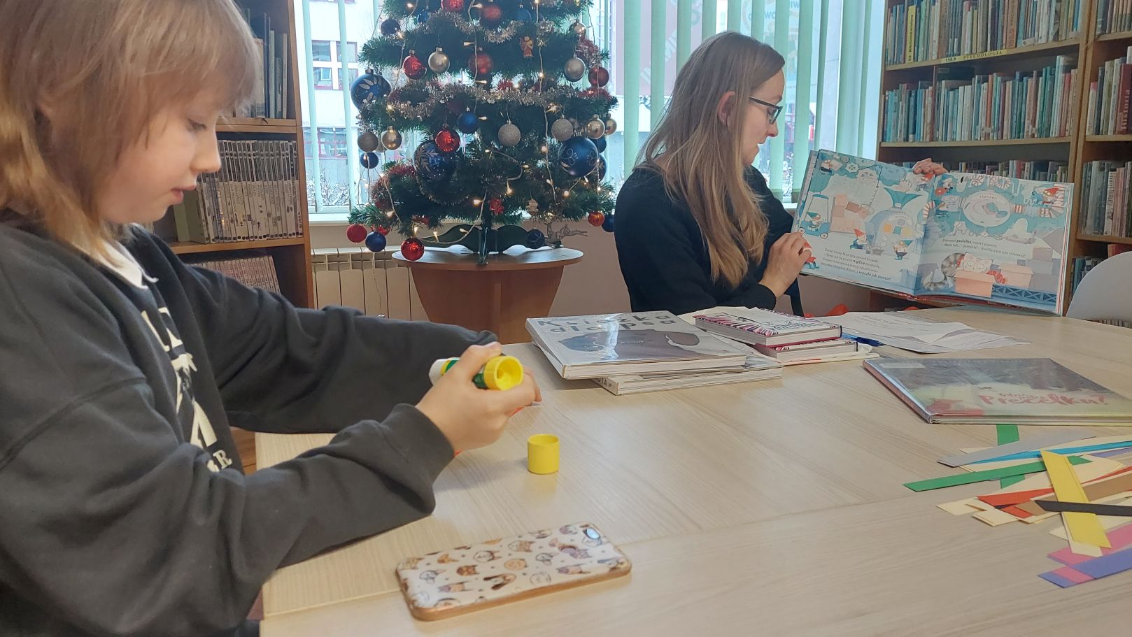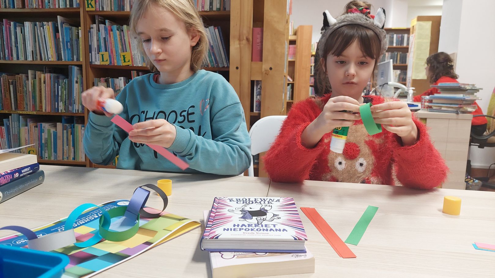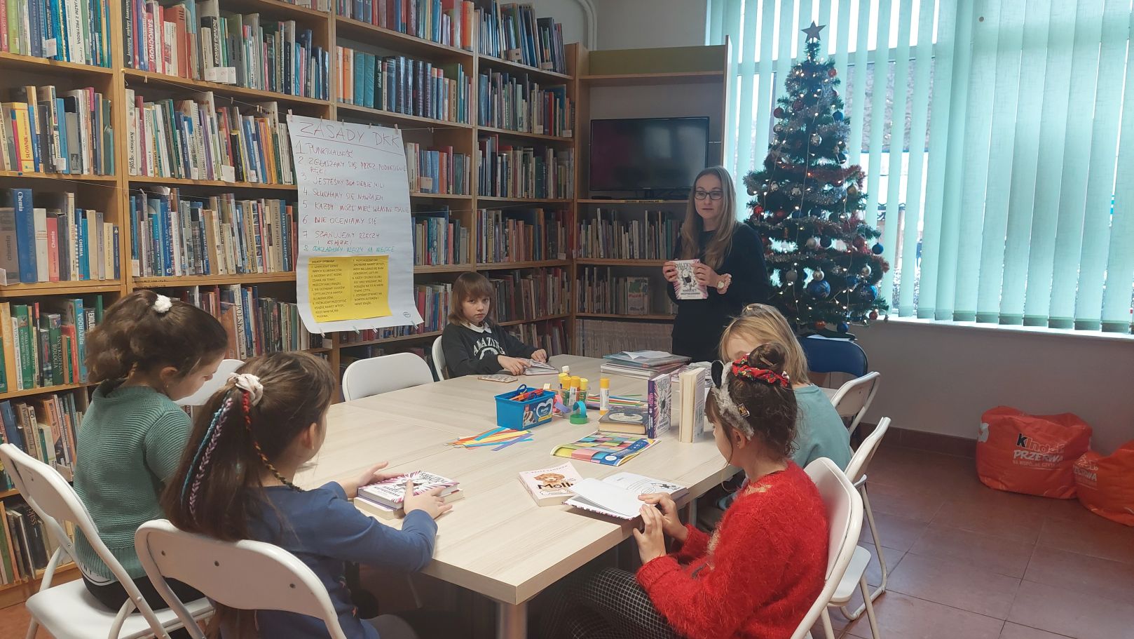 Dodatkiem do sobotniego spotkania było wysłuchanie opowieści autorstwa Lucy Rowland pt. "Mruczęty kot Mikołaja". Historia o wiecznie zaspanym kocie rozbawiła klubowiczów i nastroiła świątecznie. Dlatego w dalszej części spotkania rozmawialiśmy m.in. o pisaniu listów do św. Mikołaja, prezentach gwiazdkowych i ubieraniu choinki. A między rozmową i słuchaniem opowieści o Mruczętym, wspólnie robiliśmy kolorowy łańcuch. Naszym celem było zrobienie najdłuższego łańcucha w mieście, więc na koniec postanowiliśmy go zmierzyć. Wynik mierzenia ucieszył i zaskoczył wszystkich - aż 11 metrów! Łańcuch zawisł w Wypożyczalni dla Dzieci i jest widoczny dla wszystkich czytelników wchodzących do Oddziału dla Dzieci i Młodzieży.