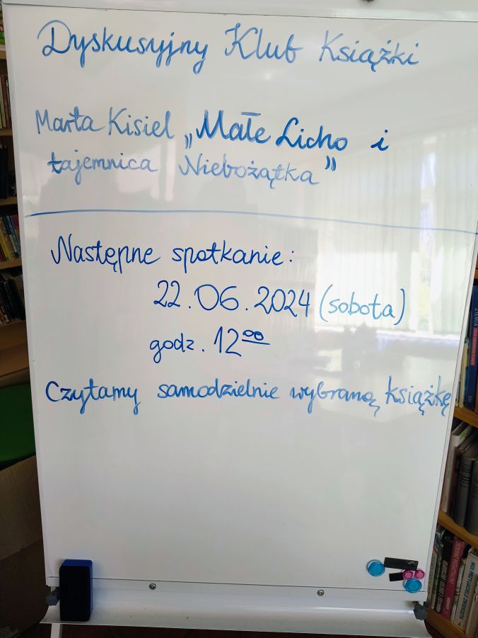 18 maja br. odbyło się comiesięczne spotkanie Dyskusyjnego Klubu Książki dla dzieci, które poświęcone było książce autorstwa Marty Kisiel pt. "Małe Licho i tajemnica Niebożątka".
