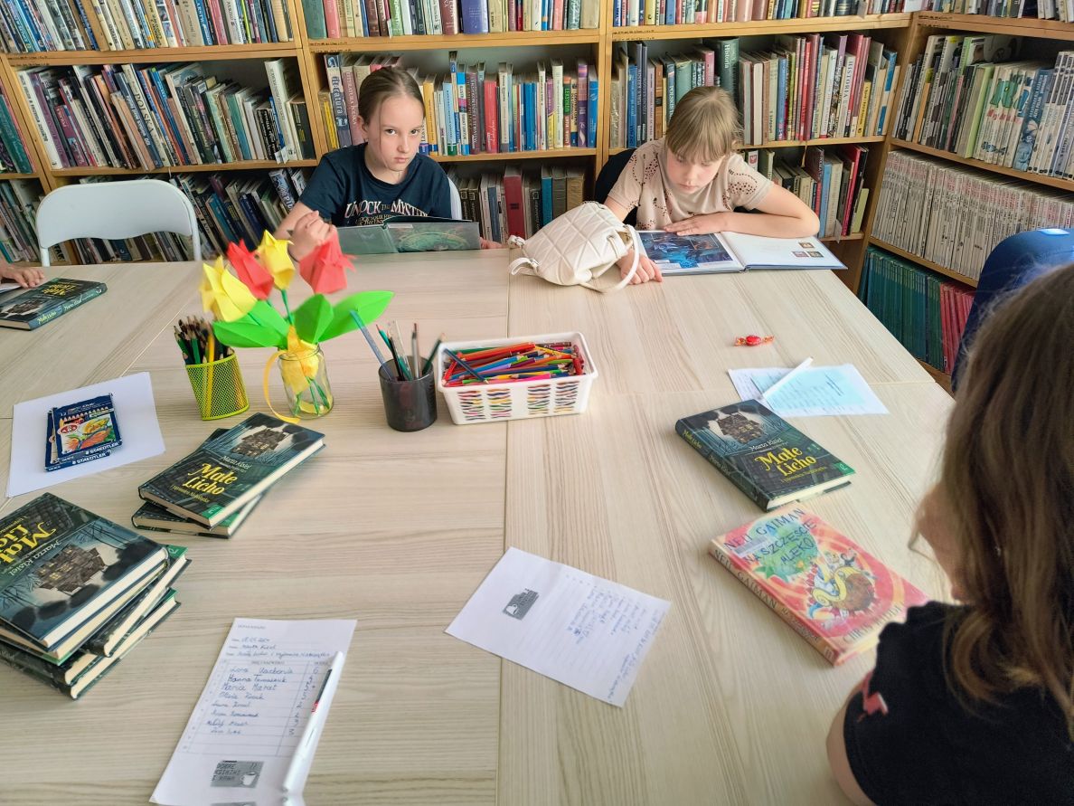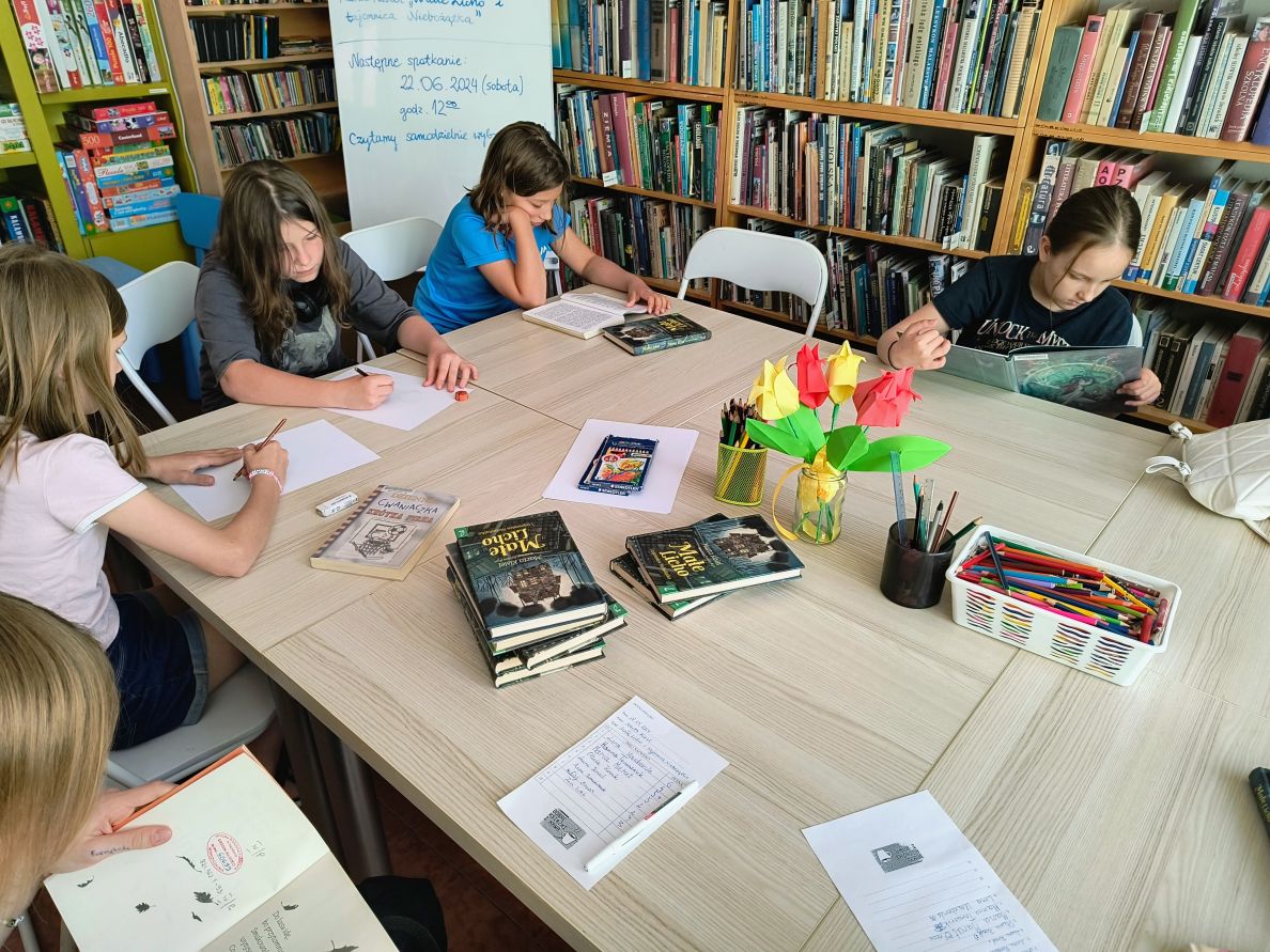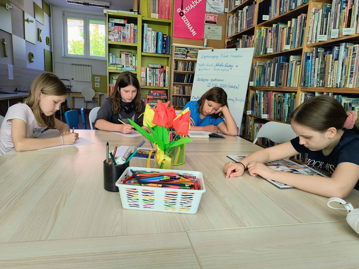 Na zakończenie spotkania każdy uczestnik samodzielnie wybrał książkę z naszej wypożyczalni, którą przeczyta i o niej opowie na kolejnym spotkaniu DKK. Niektórzy wykonali także obrazek do książki.