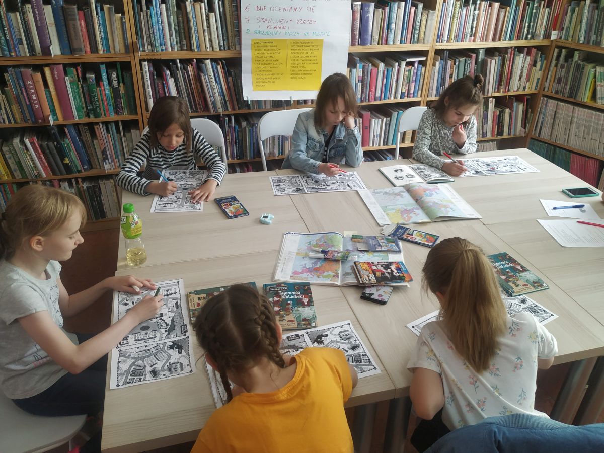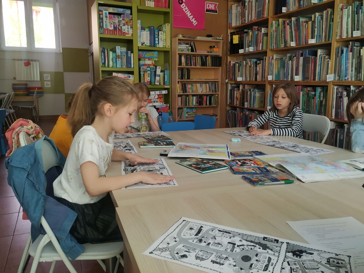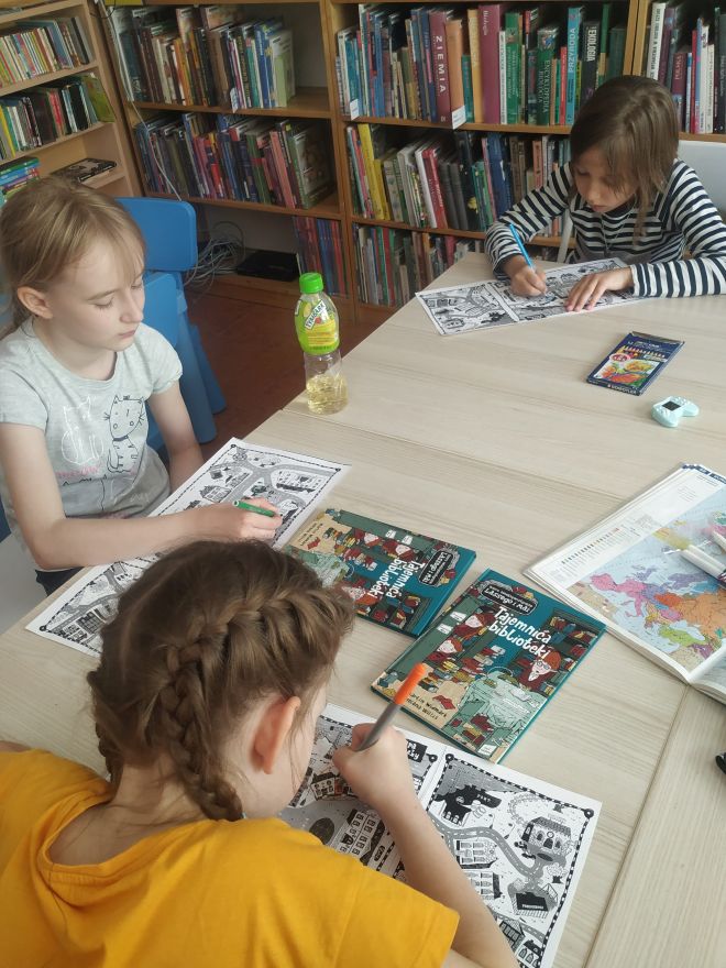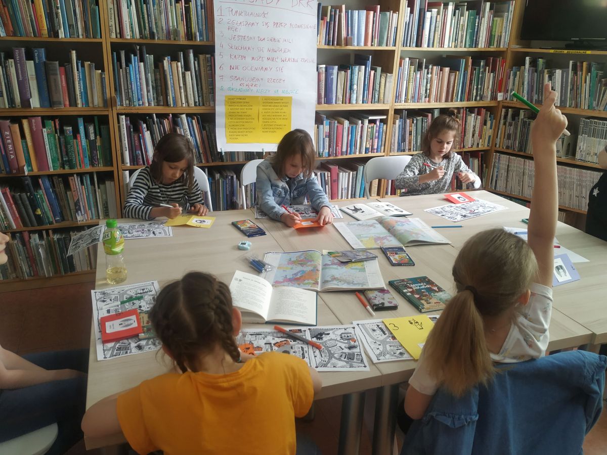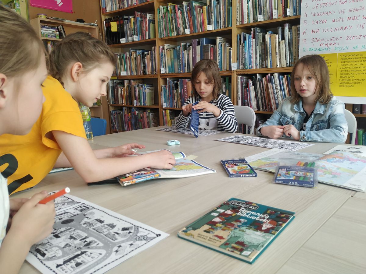 Następnie, by trochę się rozruszać, każde z dzieci odszukiwało ukryte w przestrzeni czytelni pytania dotyczące lektury. Klubowicze wyrażali opinie na temat ilustracji, swoich przewidywań dotyczących podejrzanych w śledztwie Lassego i Mai, a także poszczególnych bohaterów występujących w książce.