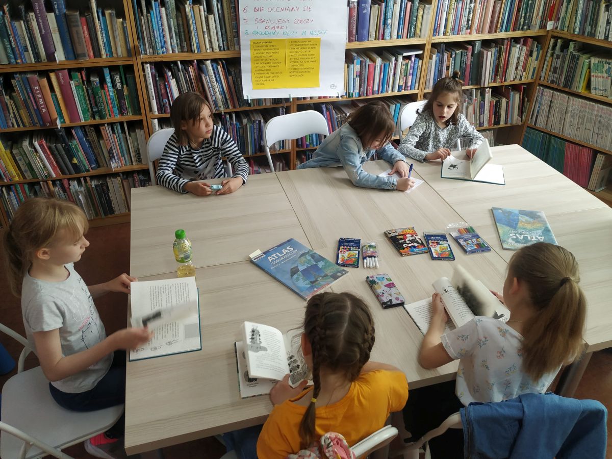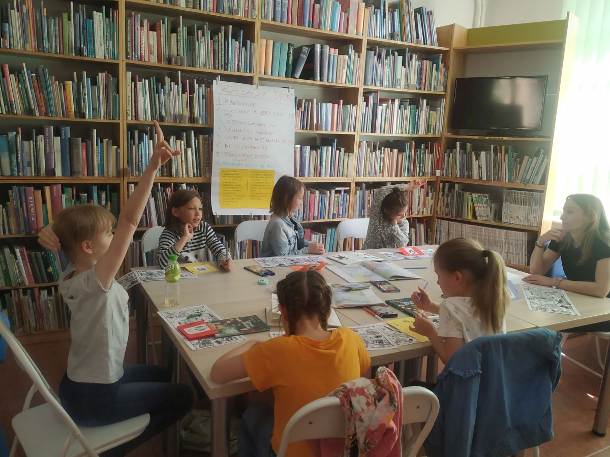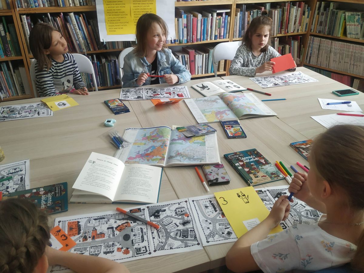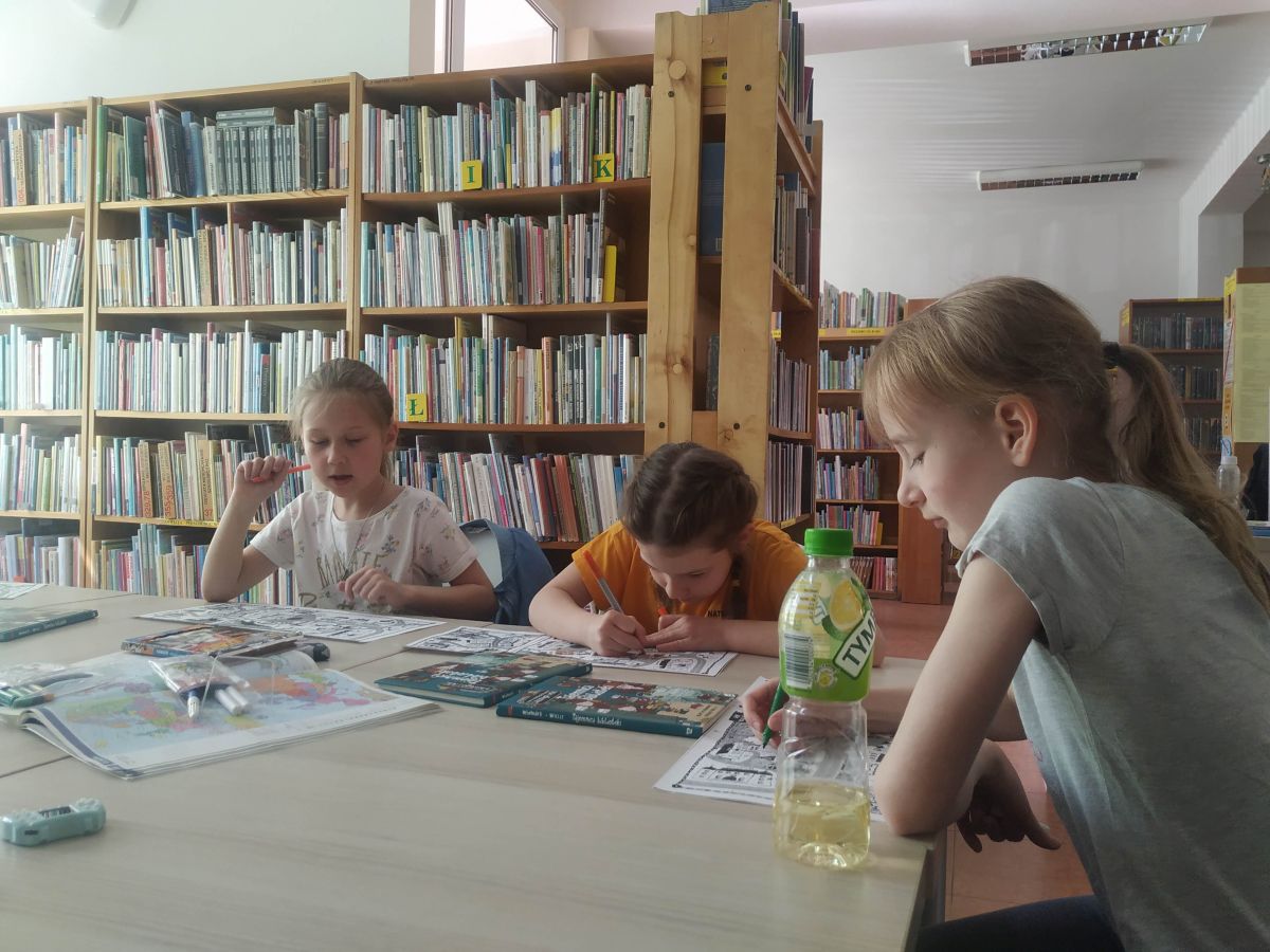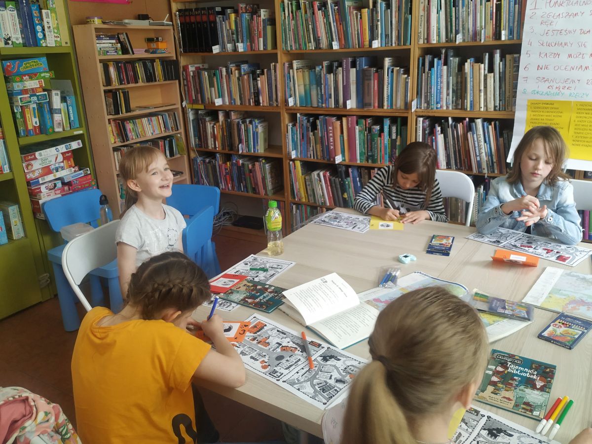Następnie, by trochę się rozruszać, każde z dzieci odszukiwało ukryte w przestrzeni czytelni pytania dotyczące lektury. Klubowicze wyrażali opinie na temat ilustracji, swoich przewidywań dotyczących podejrzanych w śledztwie Lassego i Mai, a także poszczególnych bohaterów występujących w książce.