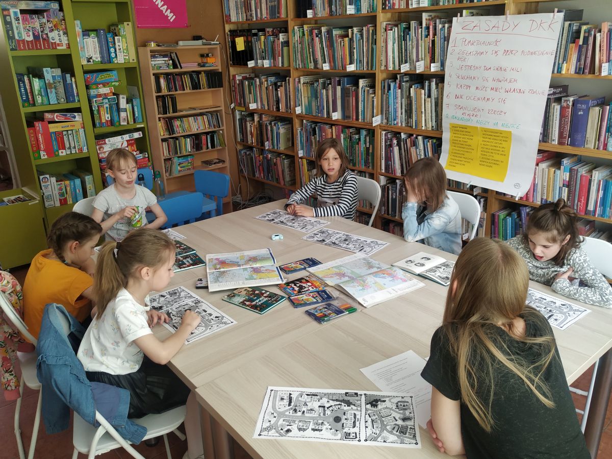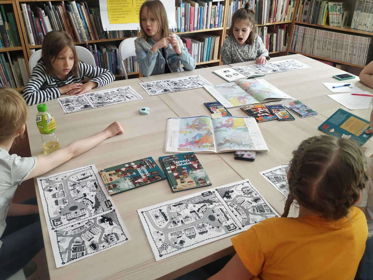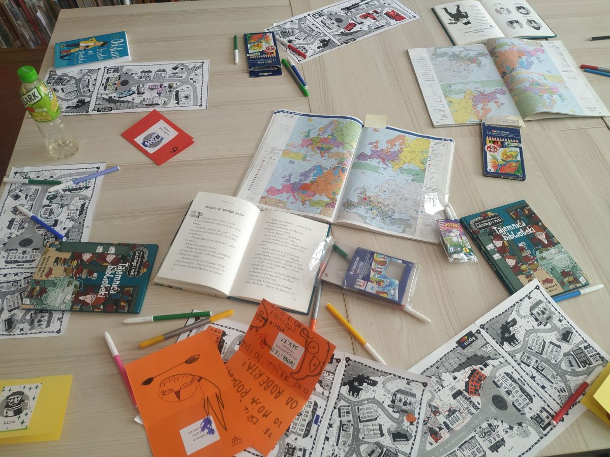 W kolejnej części spotkania każdy uczestnik otrzymał mapkę miasteczka Valleby, w którym mieszkają główni bohaterowie książki. Zadaniem klubowiczów było zaznaczenie na mapce miejsc występujących w treści książki, m. in. tytułową bibliotekę, kościół, kiosk z lodami oraz muzeum. Ponadto wyjaśniliśmy też sobie, czym jest znaczek znajdujący się w lewym dolnym rogu mapki - a była to róża wiatrów wyznaczająca kierunki stron świata.