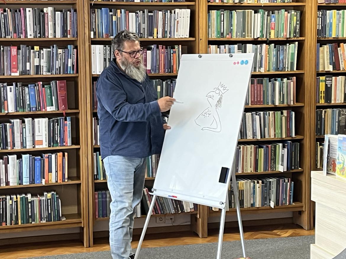 W poniedziałkowe przedpołudnie mieliśmy przyjemność gościć w czytelni Pawła Wakułę - rysownika, autora literatury młodzieżowej i dziecięcej, popularyzatora historii wśród najmłodszych czytelników, absolwenta malarstwa i pedagogiki artystycznej. Autor znany jest m. in. z takich książek jak: “Jagiełło pod prysznicem”, “Jajecznica Kolumba”, czy serii o Wikingu Bjørnie.