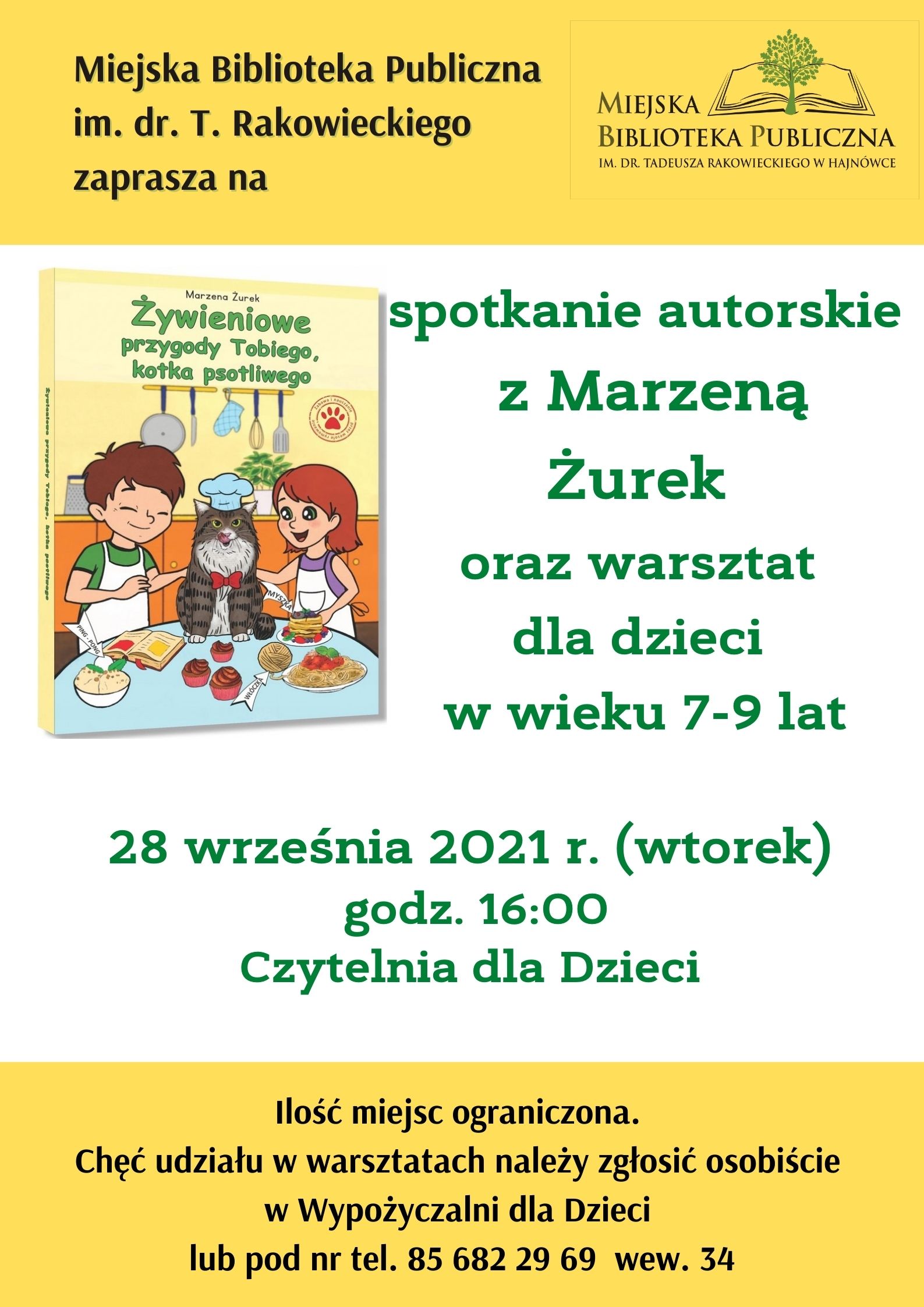 Zapraszamy dzieci w wieku 7-9 lat na spotkanie autorskie oraz warsztat z Marzeną Żurek, autorką książki pt. "Żywieniowe przygody Tobiego, kotka psotliwego", 28 września 2021 r. (wtorek), godz. 16:00, Czytelnia dla Dzieci (parter) Miejskiej Biblioteki Publicznej w Hajnówce.