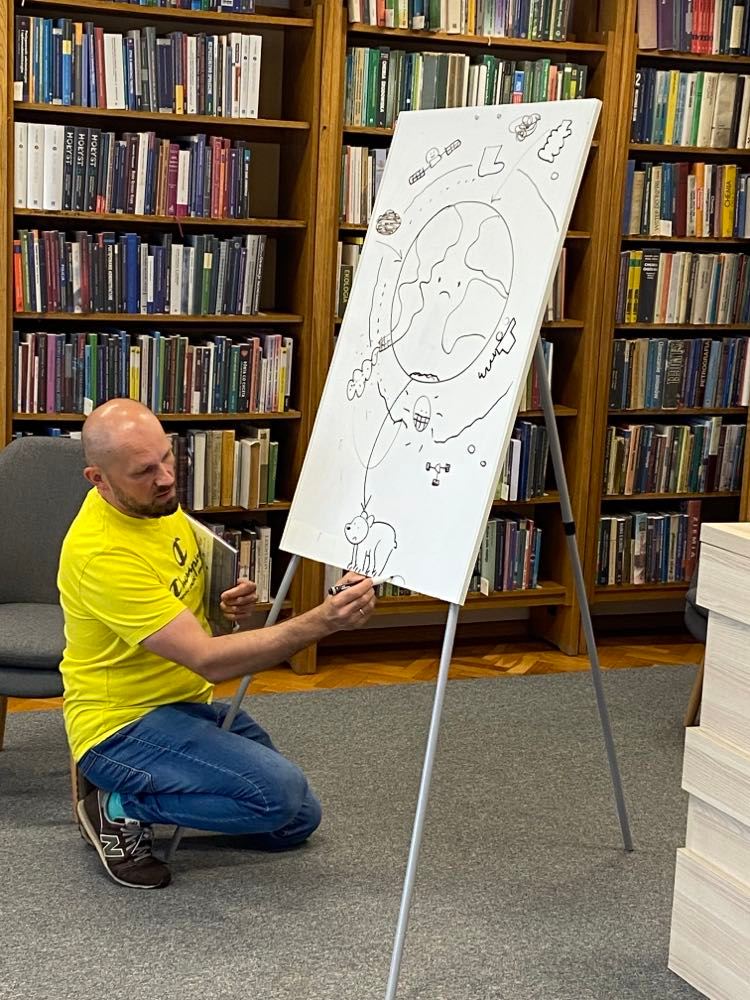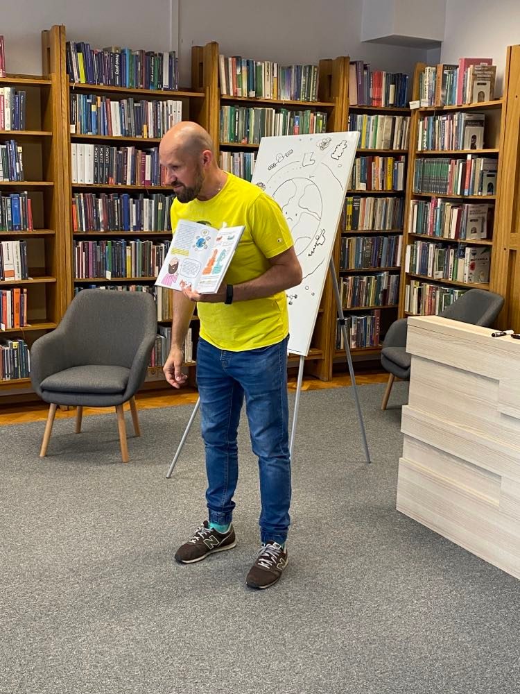 „Poradnik młodych ratowników Ziemi” metodą naukową próbuje uporządkować chaos związany z wiedzą o Wszechświecie, ewolucji i naturalnych katastrofach, zwanych również wielkimi wymarciami, które dotknęły naszą planetę. Wylicza tych katastrof aż sześć, a co gorsza, szóste wielkie wymieranie trwa obecnie, i w dużej mierze odpowiedzialny jest za nie człowiek. O tym między innymi opowiedział autor uczniom klas II i III, obecnym na spotkaniu autorskim w Miejskiej Bibliotece Publicznej im. dr. T. Rakowieckiego. Dzieci wykazały się sporą wiedzą na temat odpowiedzialności za naszą planetę, z pomocą pana Tomasza wymieniły 5 prostych kroków, dzięki którym wspólnymi siłami być może uda nam się zapobiec kolejnej wielkiej katastrofie ekologicznej. Poranne spotkanie zmotywowało uczniów do dalszego działania, mając usystematyzowaną najnowszą naukową wiedzę i świadomość, że losy Ziemi leżą również w ich rękach, wrócili do szkół z nadzieją, że przyszłość naszej cywilizacji nie jest jeszcze przesądzona.